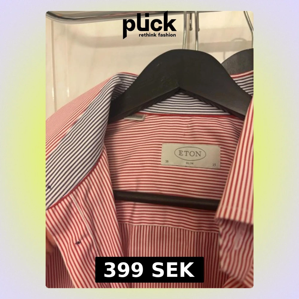 Säljer en slim fit skjorta från Eton i rödvitt randigt mönster. Skjortan har klassisk krage, långa ärmar och kontrasttyg i kragen och manschetterna med blåvita ränder. Perfekt för en clean och stilren look. Nypris runt 2000kr
