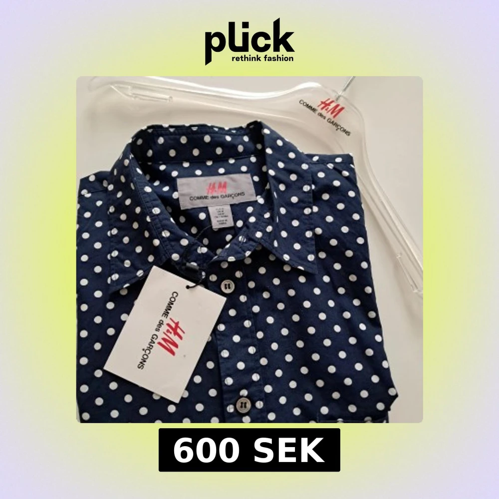 Snygg mörkblå skjorta med vita prickar från H&M x Comme des Garçons. Klassisk krage, långärmad och med knappar framtill. Skjortan är gjord i mjuk bomull och har en normal passform. Perfekt för dig som gillar coola samarbeten och grafiska mönster.