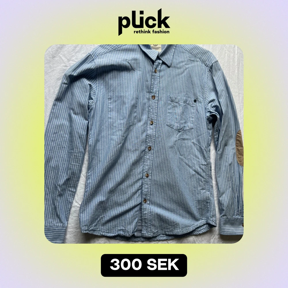 Säljer en snygg blå randig skjorta från Selected Jeans. Skjortan har långa ärmar och bruna knappar, samt stiliga armbågslappar i beige. Perfekt för vardag!