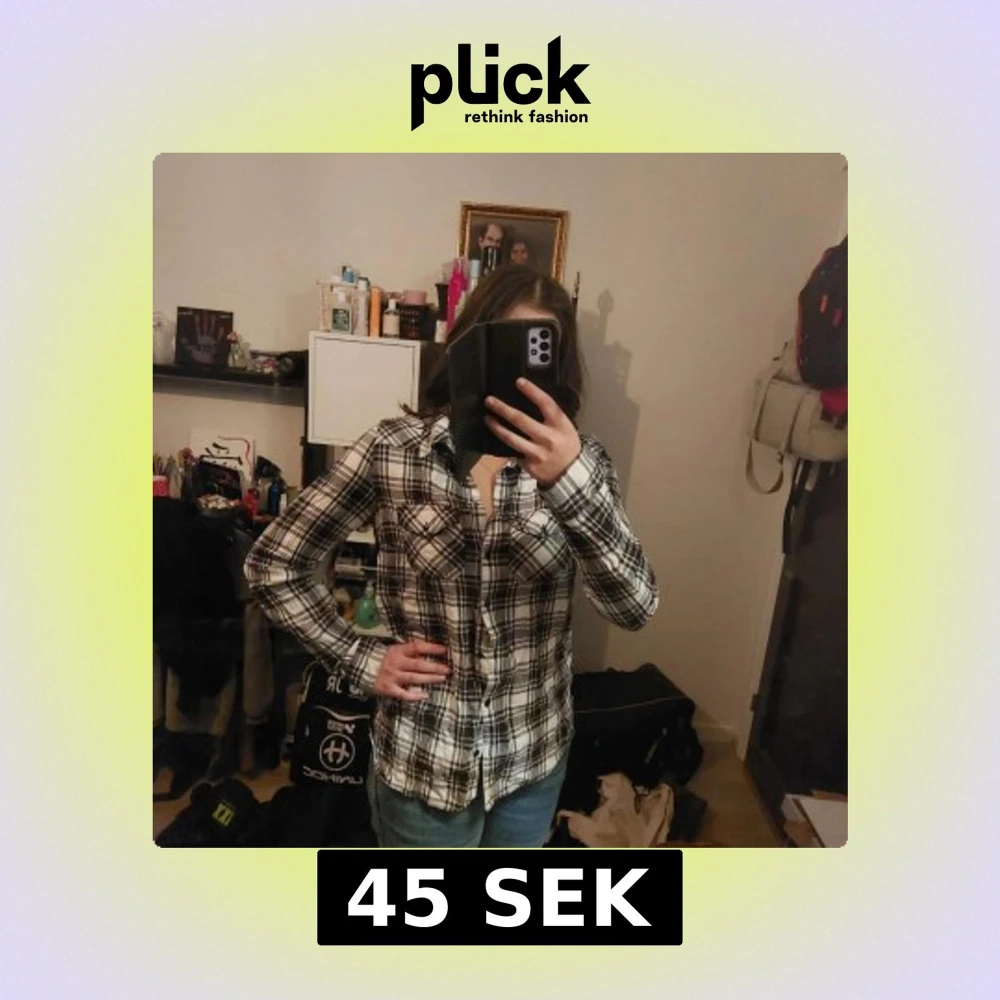 Säljer en snygg rutig skjorta i svart och vit med långa ärmar och knappar framtill. Perfekt för en avslappnad stil.