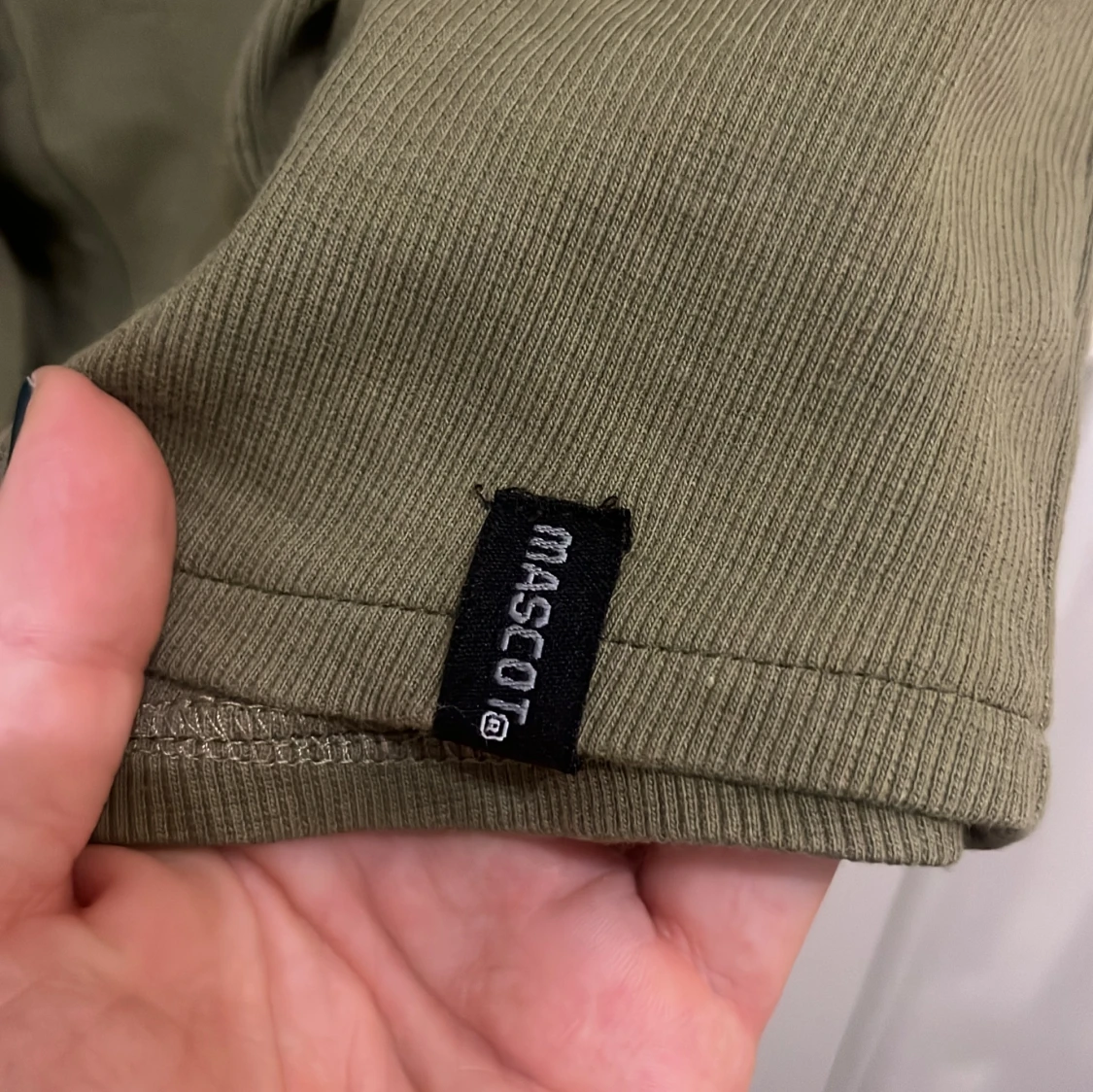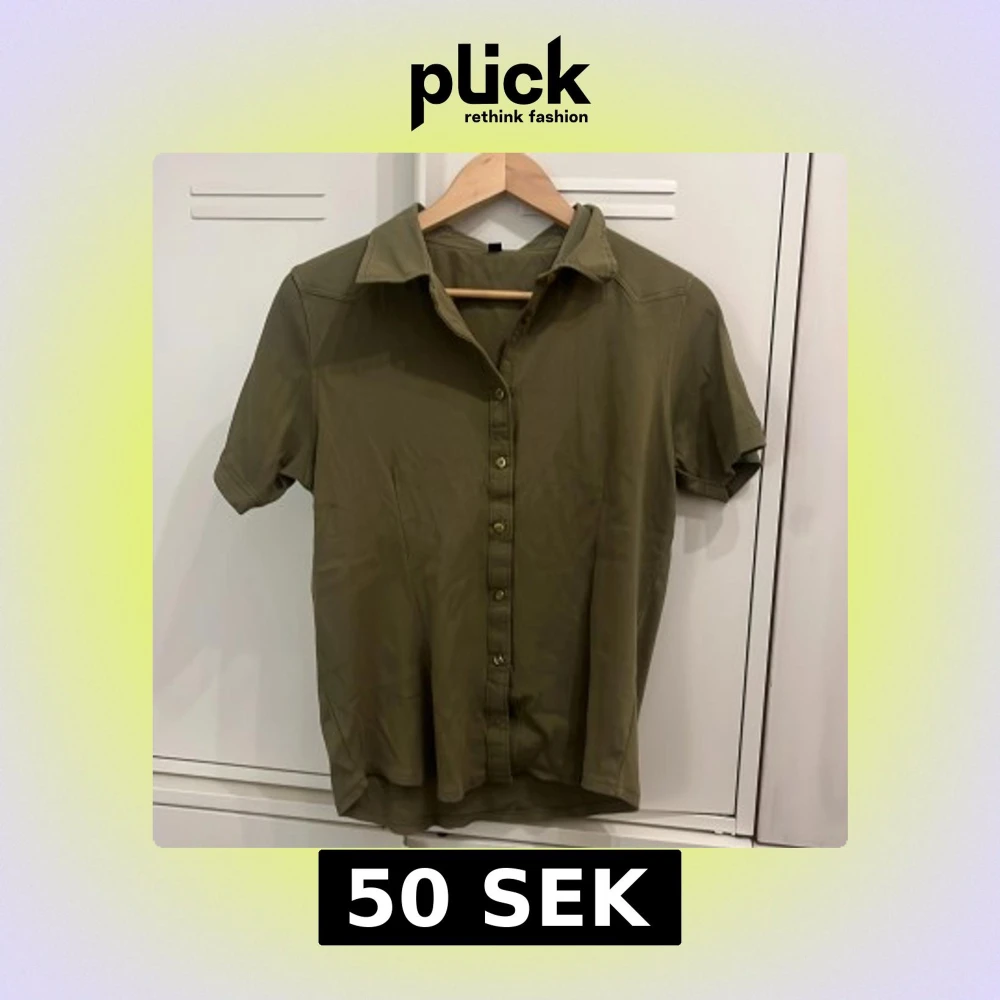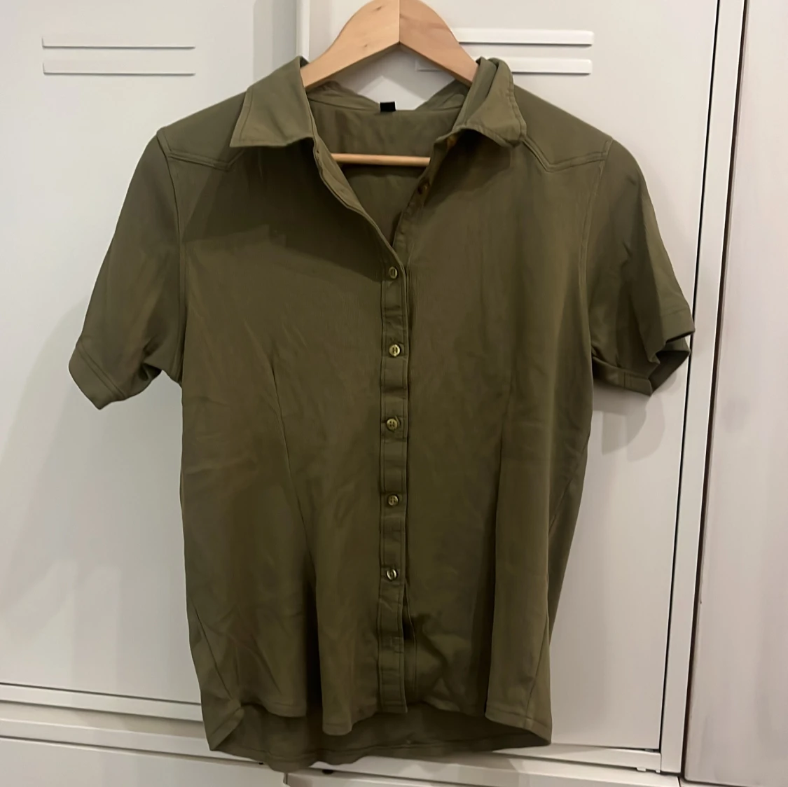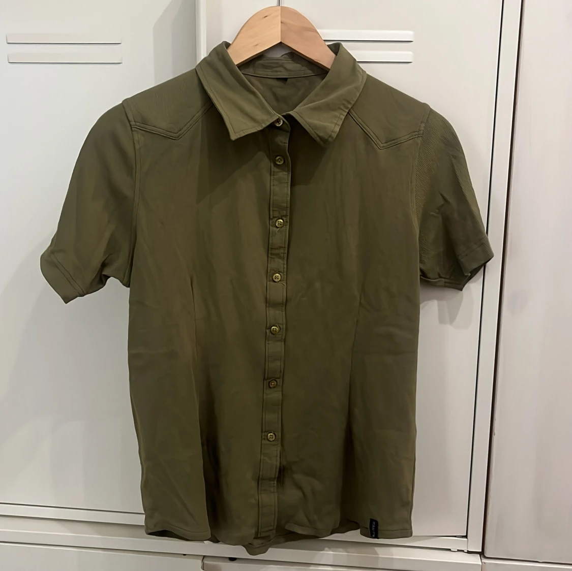 Säljer en olivgrön skjorta från Mascot med korta ärmar och klassisk krage. Skjortan har knappar hela vägen framtill och är gjord i ett mjukt bomullstyg.