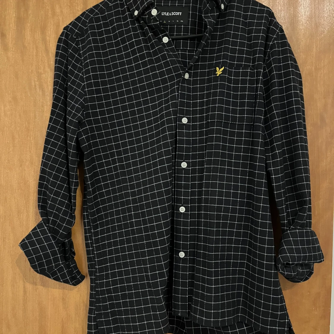 Snygg svart skjorta från Lyle & Scott med vitt rutmönster och ikonisk logga på bröstet. Skjortan har långa ärmar och knappar framtill. Perfekt för en stilren look.