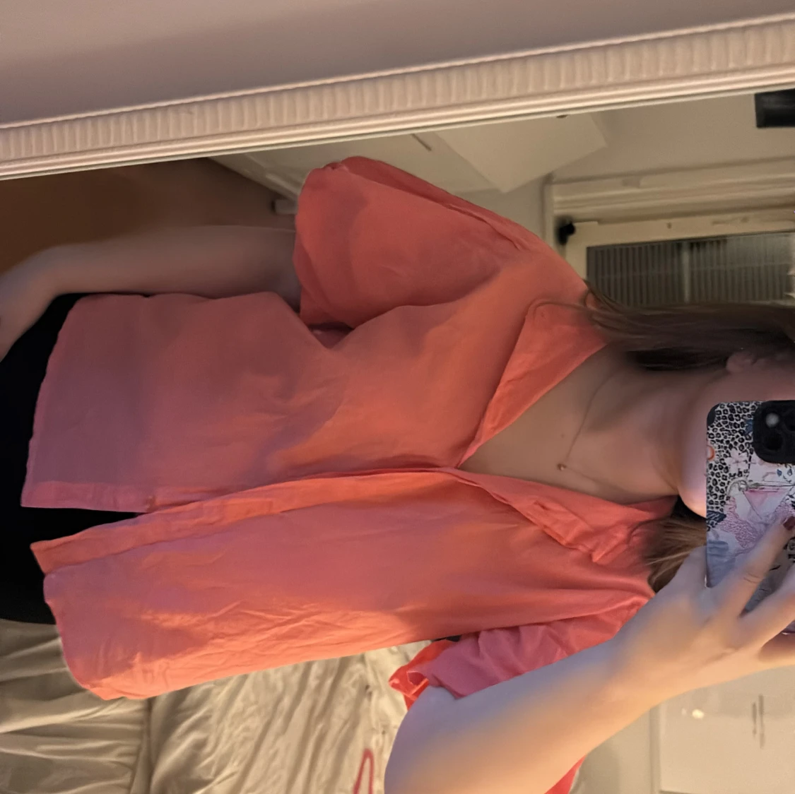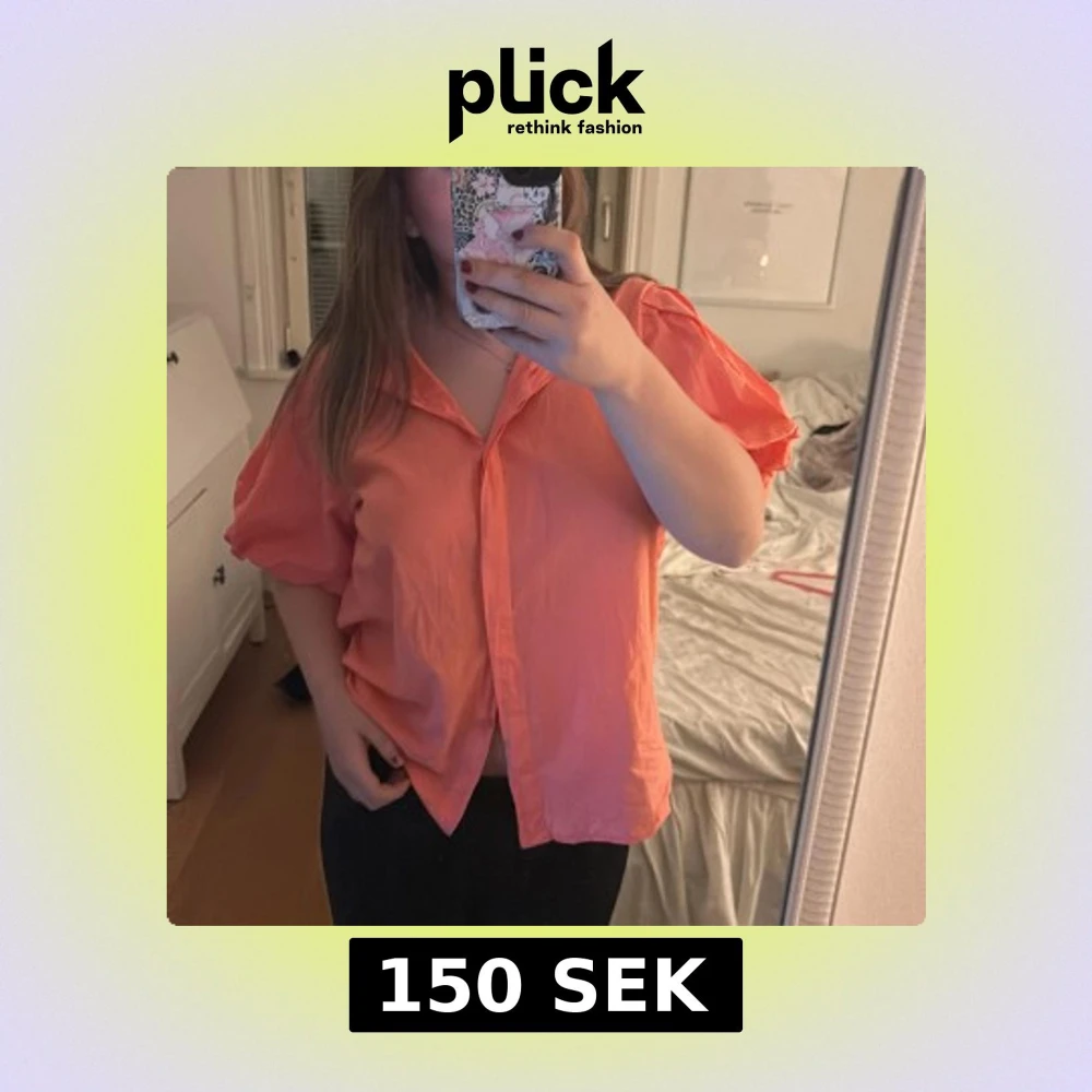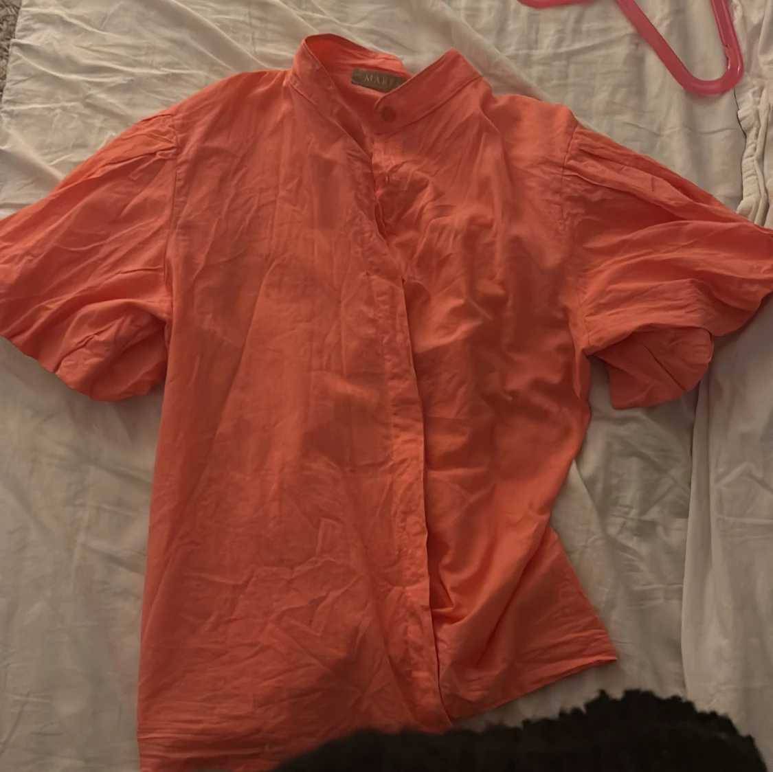 Säljer en korallrosa skjorta från marta med korta, puffiga ärmar och knappar framtill. Skjortan har en lös passform och är tillverkad i ett lätt bomullstyg, perfekt för varmare dagar. Snygg krage och enkel att styla till olika outfits.