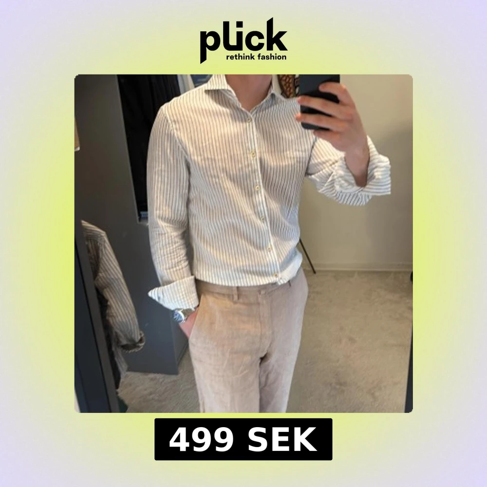 Säljer en klassisk vit skjorta med tunna blå ränder från Stenströms. Skjortan har lång ärm, knappar framtill och en snygg krage. Perfekt för en stilren look och tillverkad i mjuk bomull och linne.