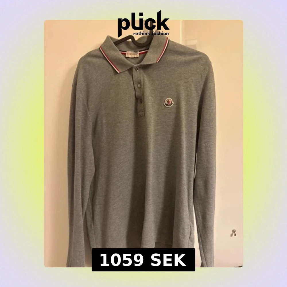 Snygg grå långärmad pikétröja från Moncler med klassisk krage och knappar framtill. Tröjan har Moncler-logga på bröstet och diskreta röda och vita detaljer på kragen. Perfekt för dig som gillar stilrena och exklusiva plagg. L passar M mer