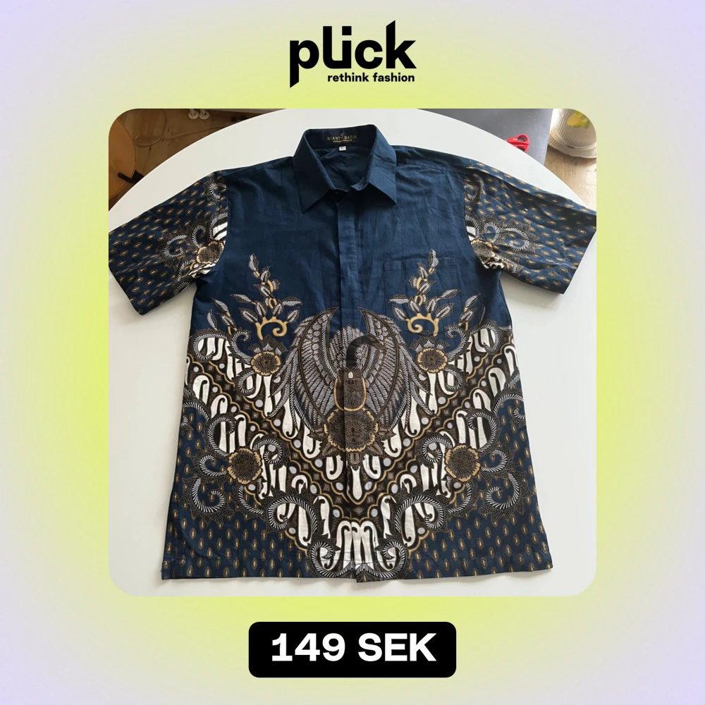 Säljer en unik batikskjorta i mörkblått med ett detaljerat mönster i vitt och guld. Skjortan har korta ärmar och en klassisk krage. Perfekt för sommaren. Materialet känns lätt och luftigt, vilket gör den perfekt för varma dagar. Inköpt på resa till Bali.