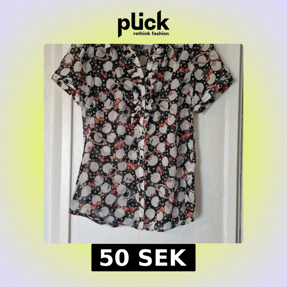 Snygg blus från Red Label i storlek L med svart botten och stora vita prickar, röda detaljer och pärlmotiv. Blusen har korta ärmar, volang vid knäppningen och är tillverkad i ett tunt, lätt material som känns luftigt. Dtorlekdmärkningen är dock något skev. Jag skulle snarare säga att den storleksmässigt är som en S eller M.