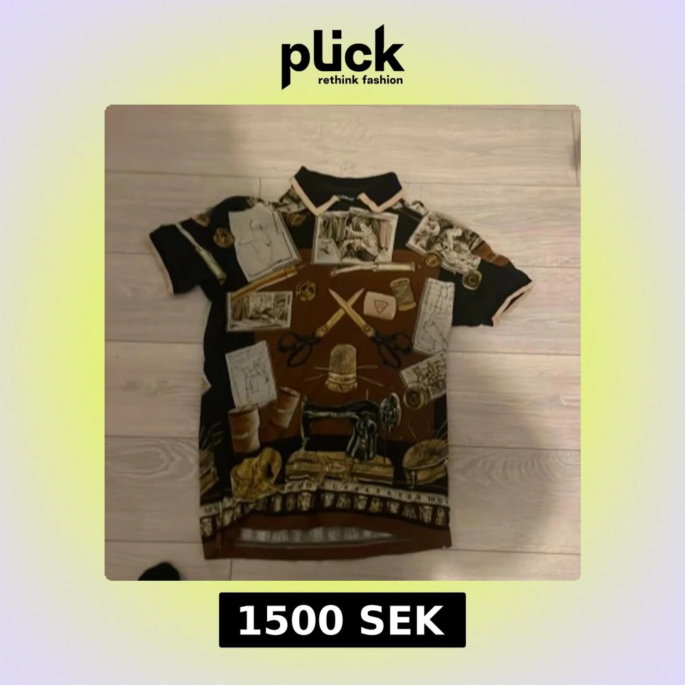 Säljer en unik kortärmad skjorta från Dolce & Gabbana med ett kreativt mönster av skräddartillbehör. Skjortan har en mörk bas med detaljer i beige och guld, samt en klassisk krage. Perfekt för den som vill sticka ut med stil.