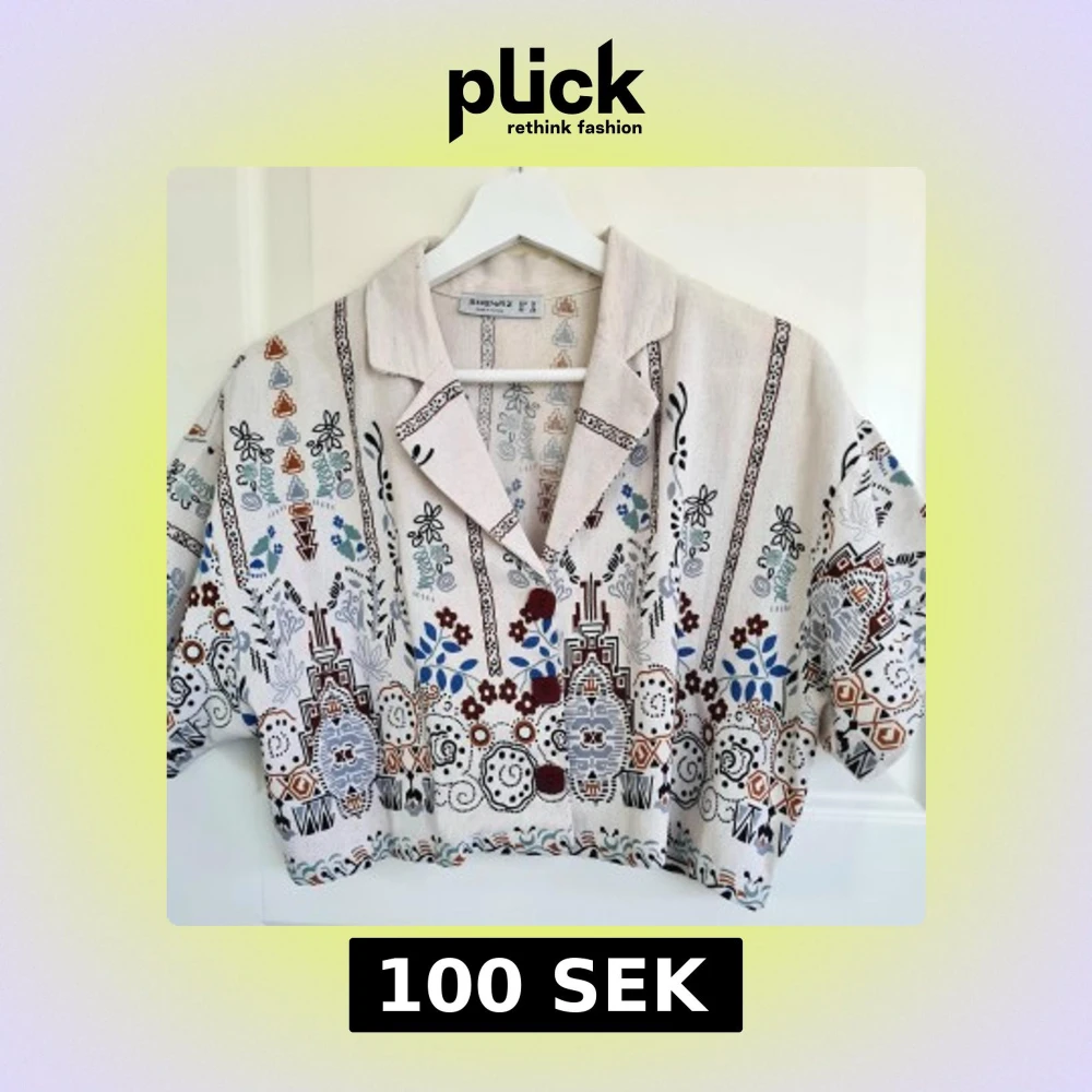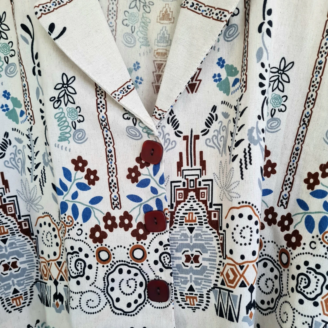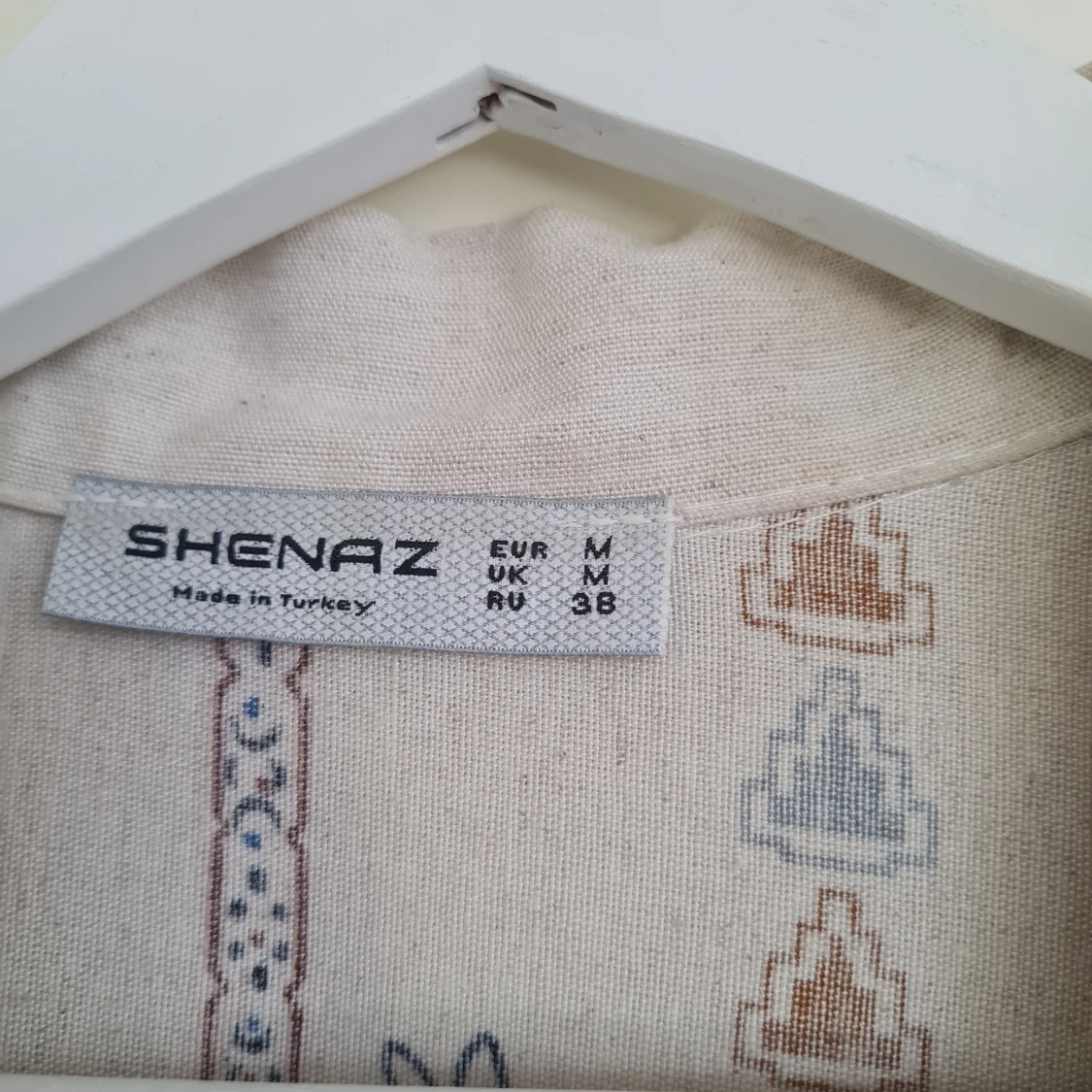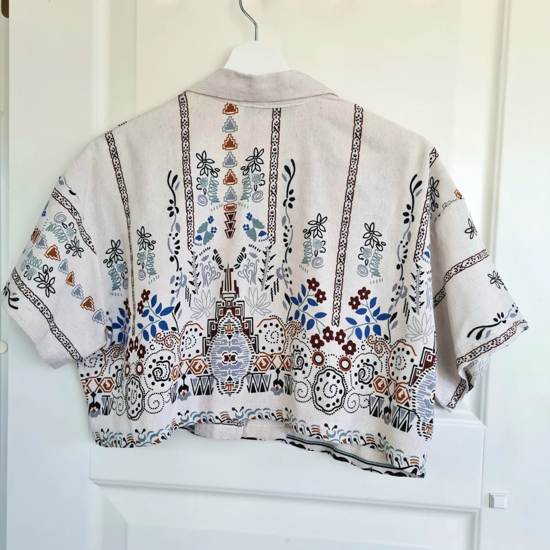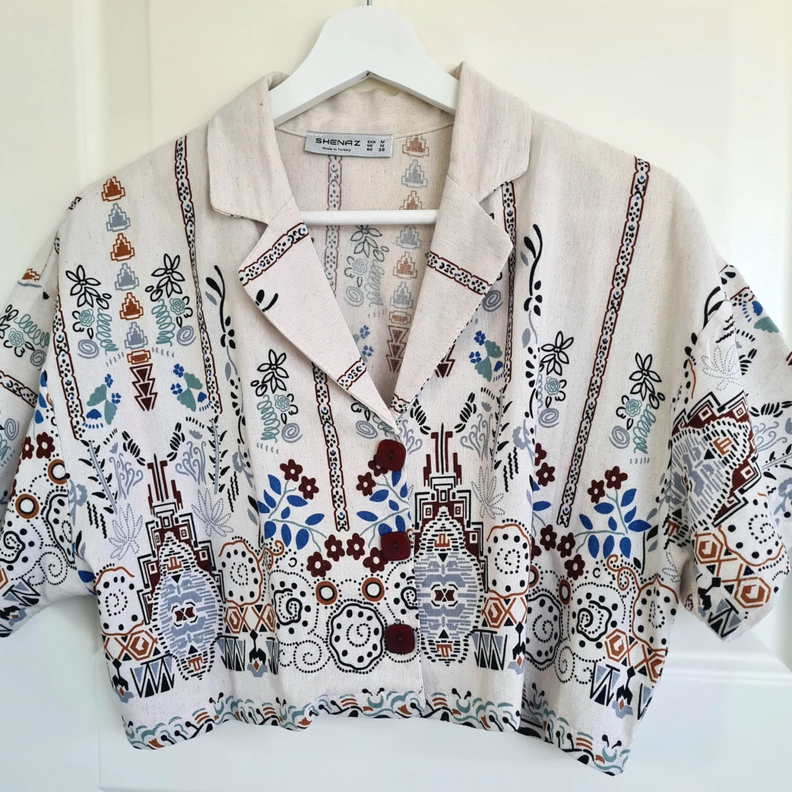Unik skjorta från Shenaz i beige med färgglatt grafiskt och blommigt mönster i blått, brunt och svart. Skjortan har korta ärmar, krage och tre bruna knappar framtill. Tillverkad i ett linneliknande material och har en avslappnad passform.