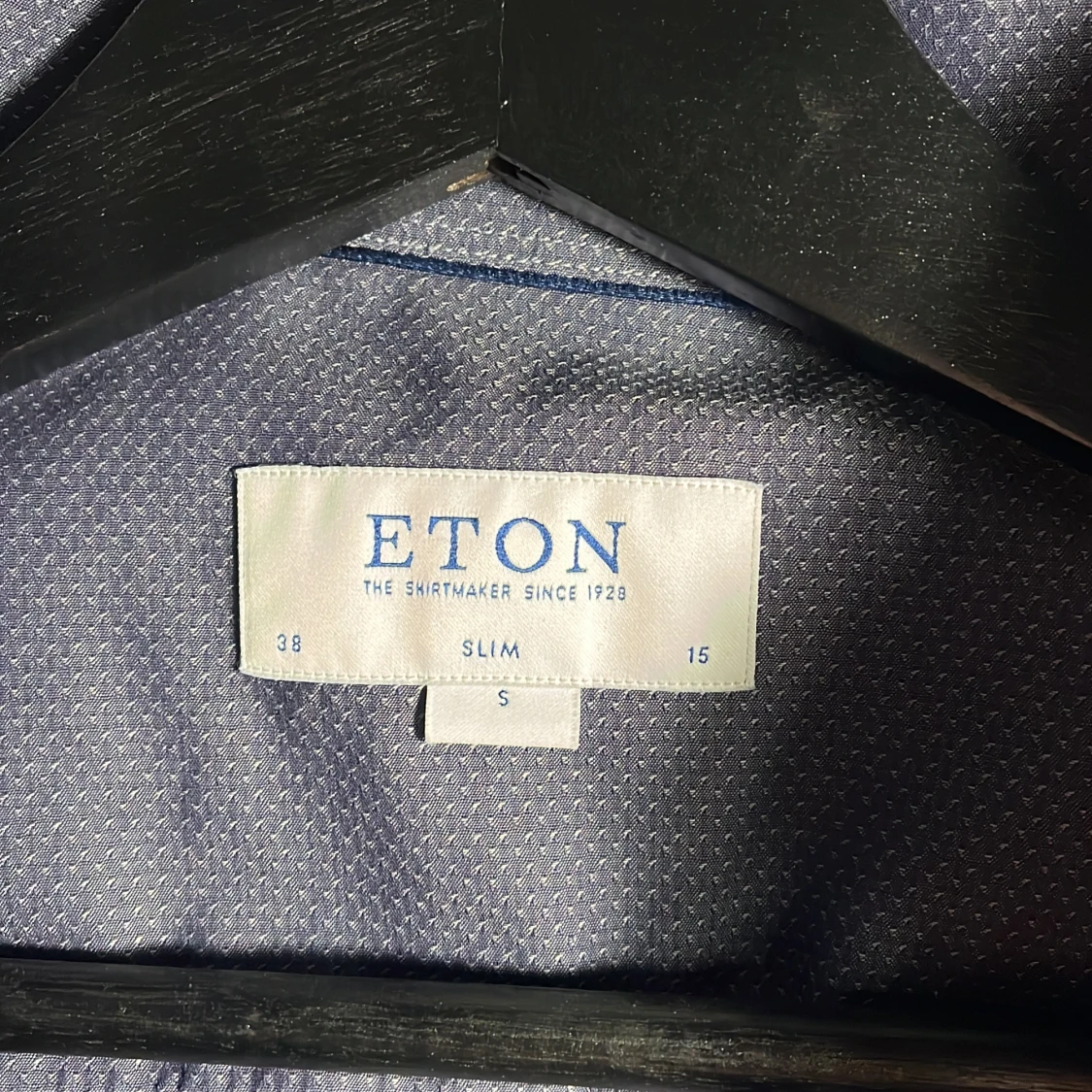 Snygg och stilren skjorta från det mycket välkända märket ETON. Mycket sparsamt använd med otrolig kvalitet. Häftigt mönster och bra passform. Storleken är slim 38, vilket motsvarar en storlek S. Hör av er vid minsta fundering eller om ni vill ha flera bilder på plagget. Kolla gärna in min profil för fler kläder⭐️