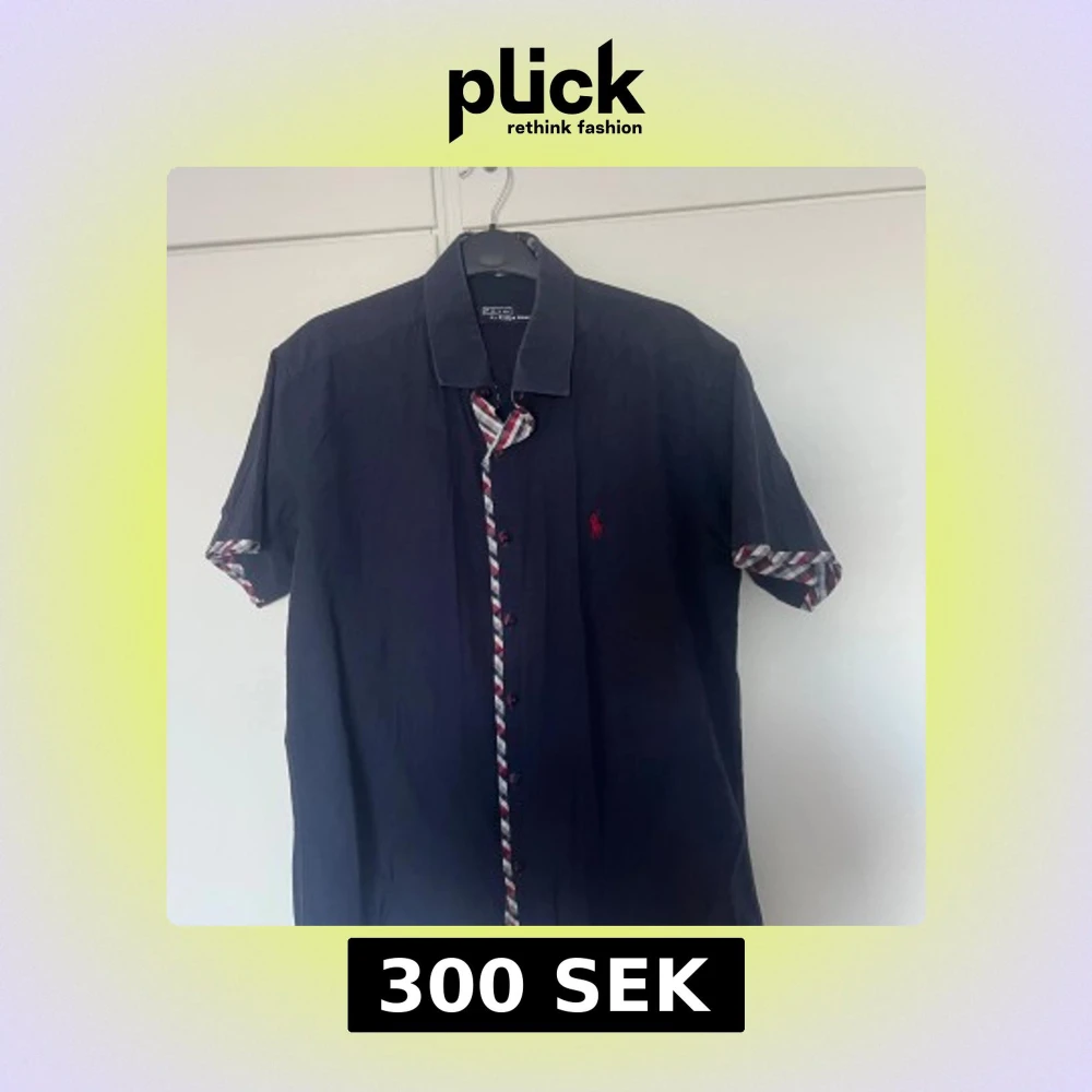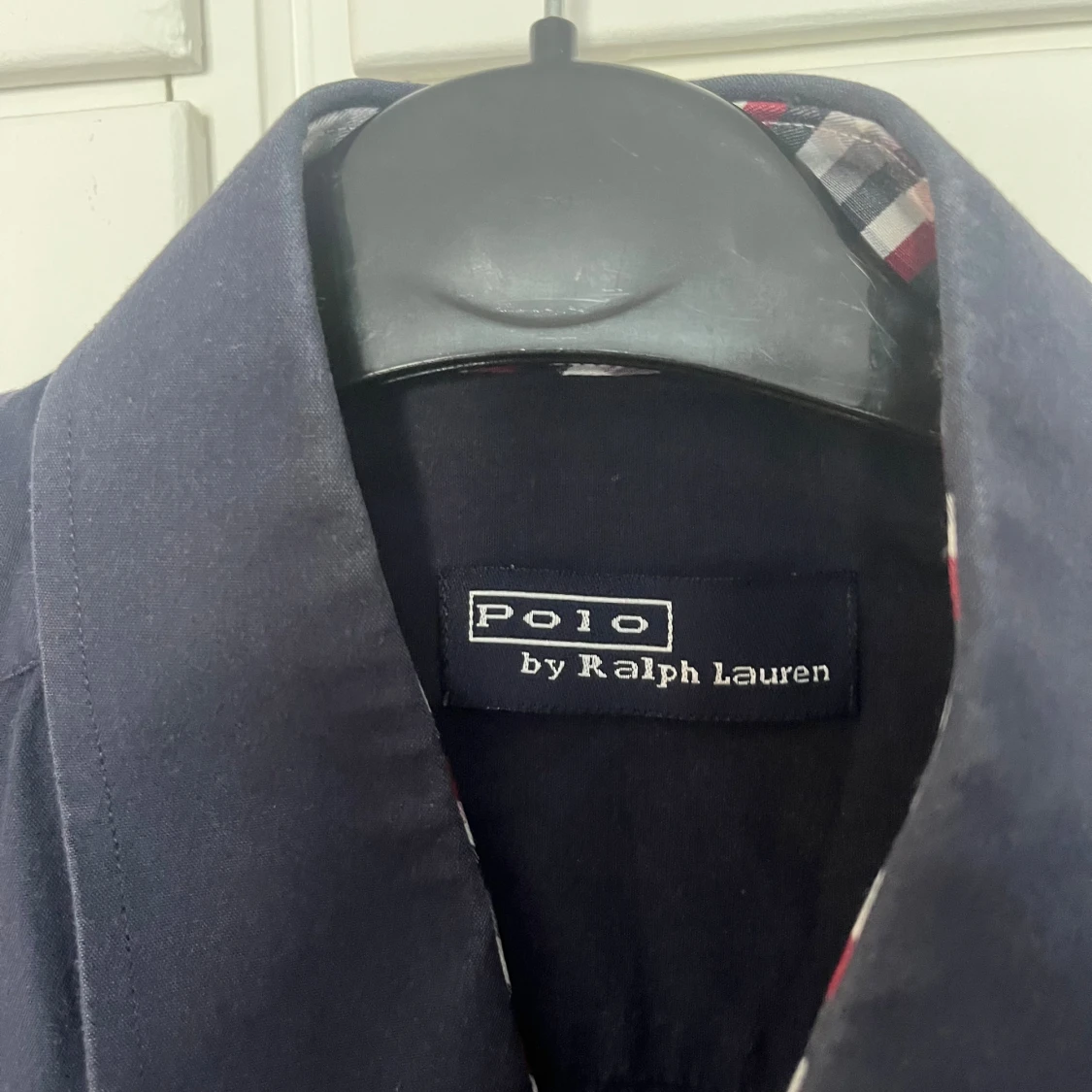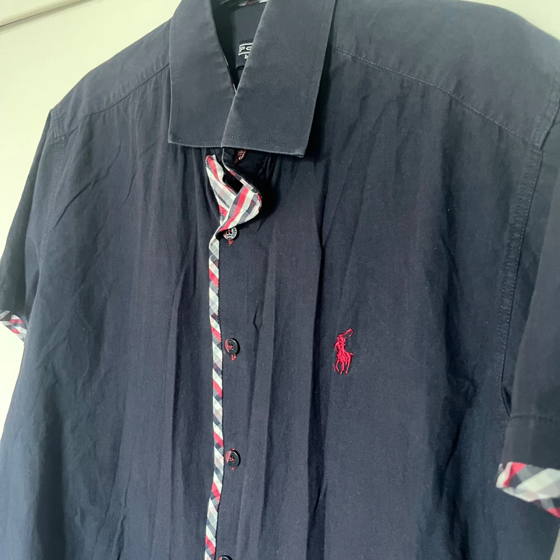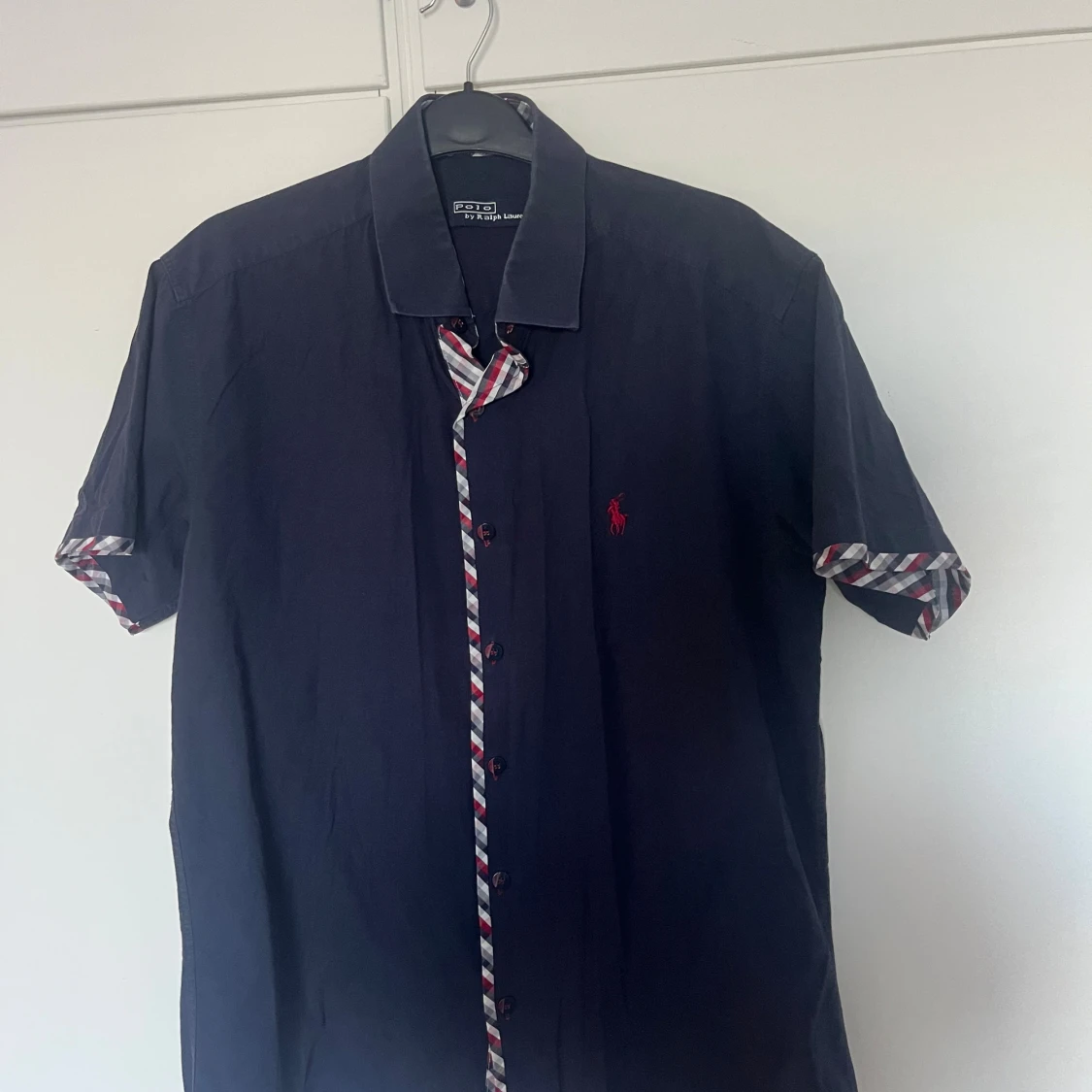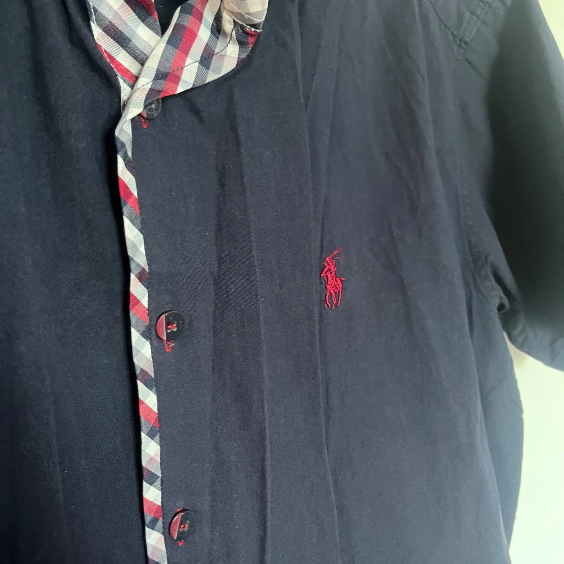 Snygg mörkblå skjorta från Polo Ralph Lauren med korta ärmar och rutiga detaljer i rött, vitt och blått vid knappslå och ärmslut. Klassisk krage och röd broderad logga på bröstet. Perfekt för dig som vill ha en stilren men ändå unik look.