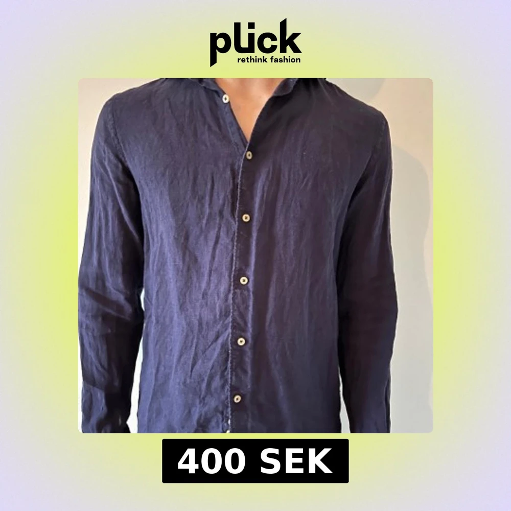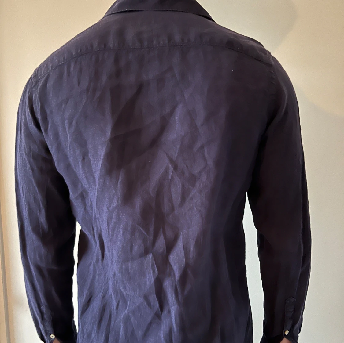 Snygg mörkblå skjorta i linne med långa ärmar och knappar framtill. Perfekt för en stilren look.