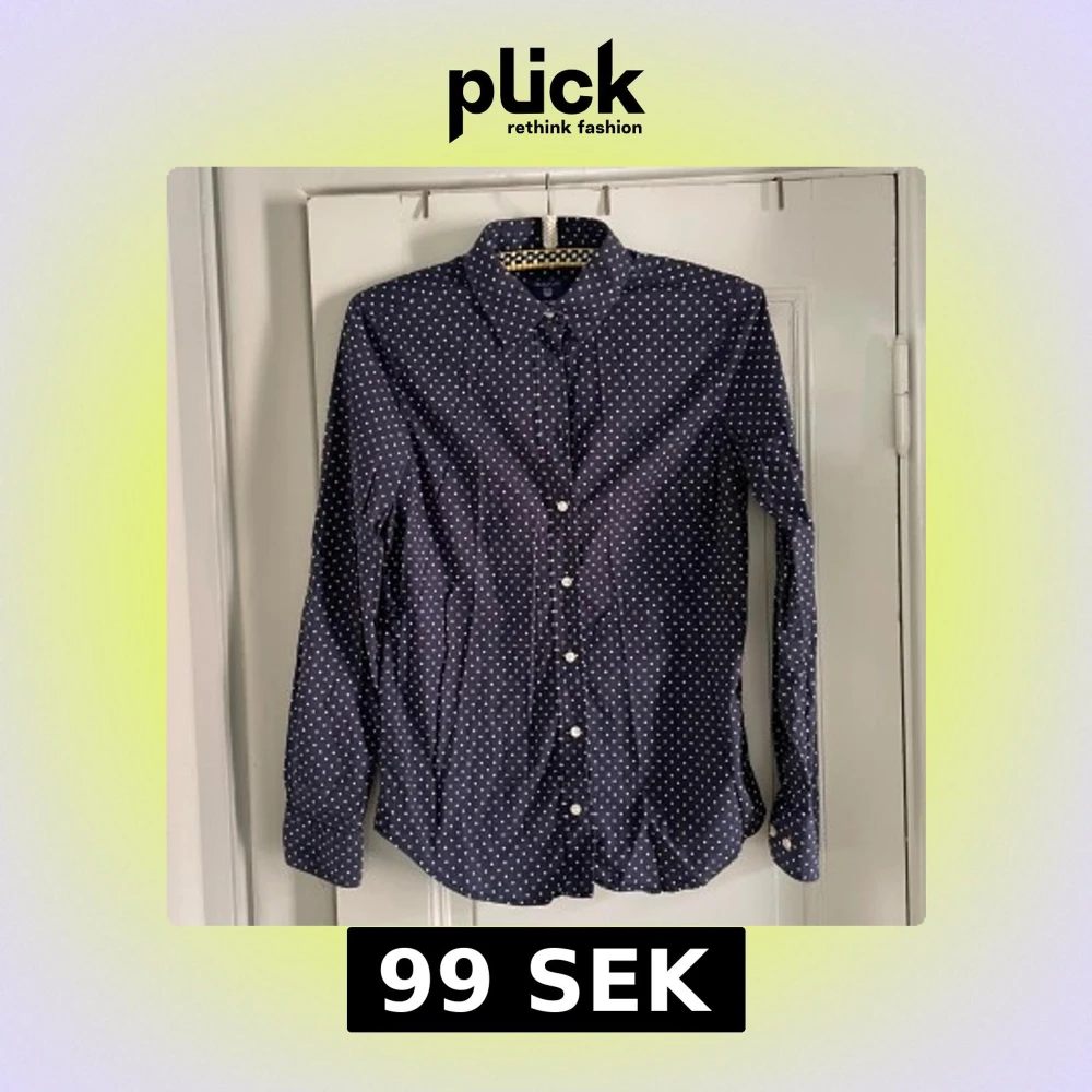Snygg mörkblå skjorta från Gant med vita prickar och klassisk krage. Den är i fint skick, storlek 36 och något figursydd. Skjortan har långa ärmar, knappar framtill och broderad Gant-logga på bröstet. Tillverkad i mjuk bomull som känns skön mot huden. Perfekt för dig som gillar stilrena mönster och klassisk look💙