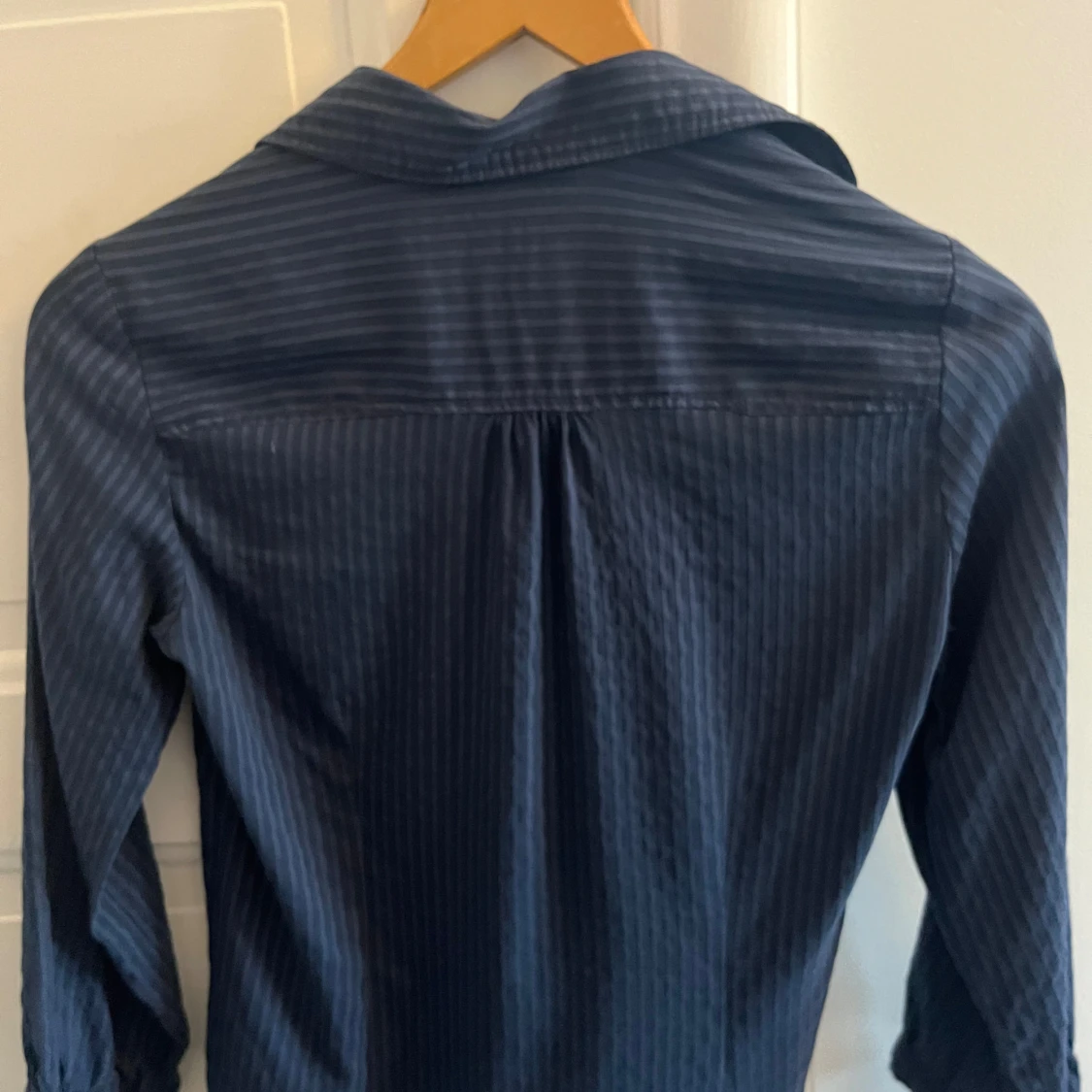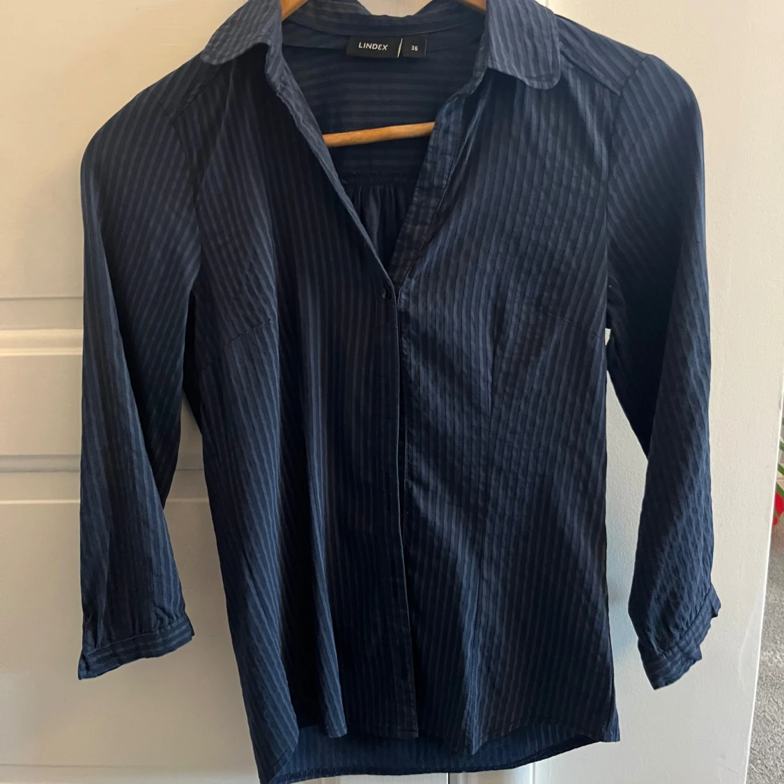 Snygg mörkblå skjorta från Lindex med diskreta ränder och knappar framtill. Skjortan har en klassisk krage och trekvartsärmar, perfekt för en stilren look. Passar bra till både jeans och kjol.