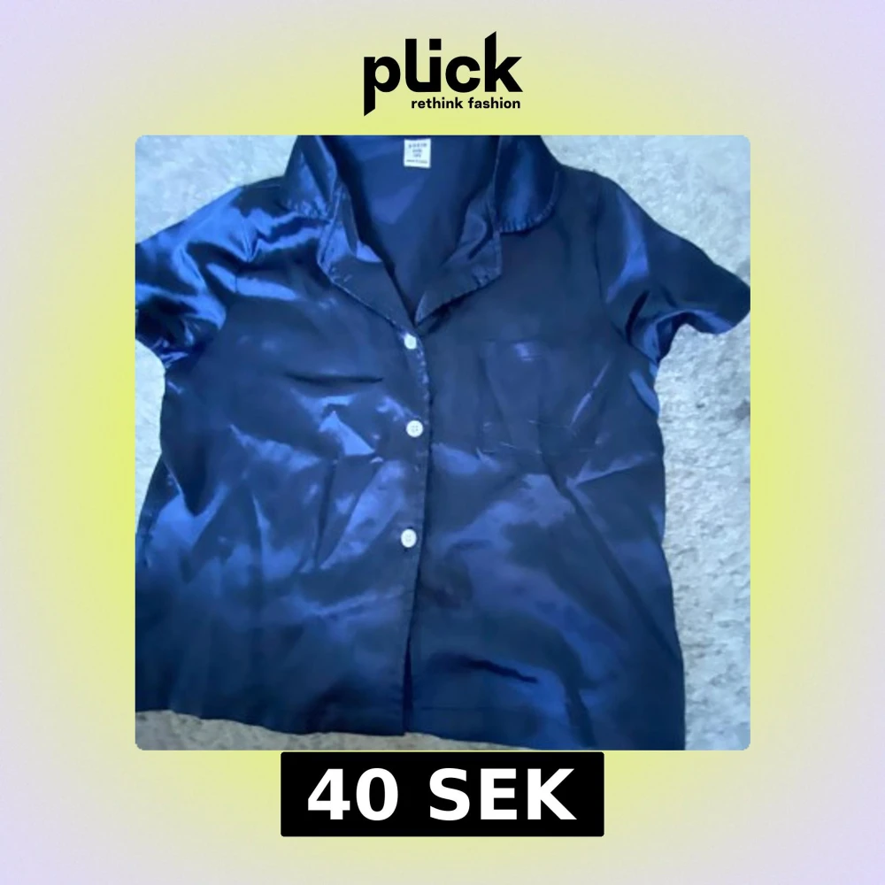 Snygg mörkblå pjamas tröja från SHEIN i satinliknande material. Tröjan har korta ärmar, klassisk krage, vita knappar framtill och en bröstficka. Perfekt för dig som gillar en lite glansig och stilren look.