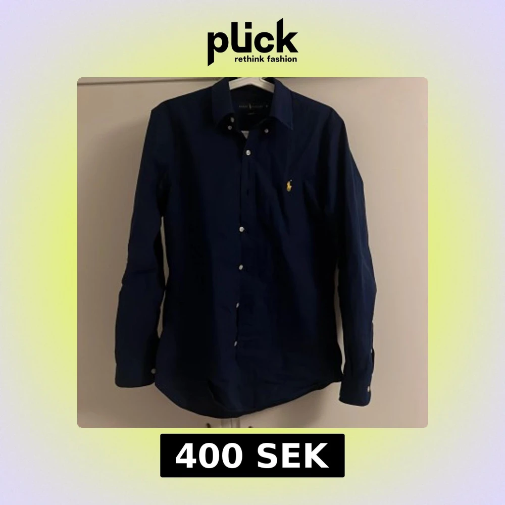 Säljer en mörkblå skjorta från Ralph Lauren i slim fit-modell. Skjortan har klassisk krage, vita knappar och den ikoniska gula loggan broderad på bröstet. Perfekt för dig som gillar stilrena och tidlösa plagg.
