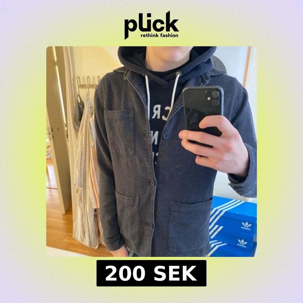 Säljer en mörkblå overshirt med grov struktur och tre stora fickor framtill. Jackan har knappar och lång ärm, perfekt att slänga över en hoodie. Enkel och stilren design som funkar till jeans eller chinos.