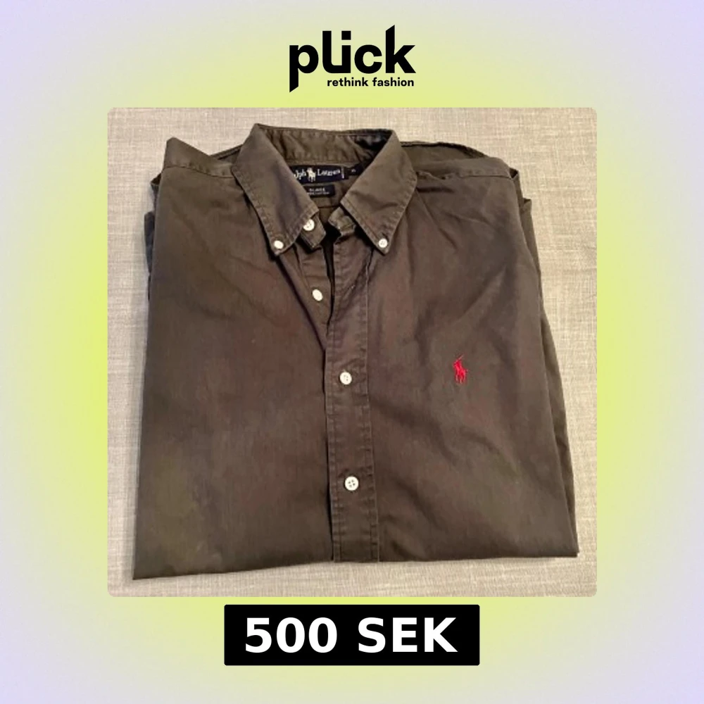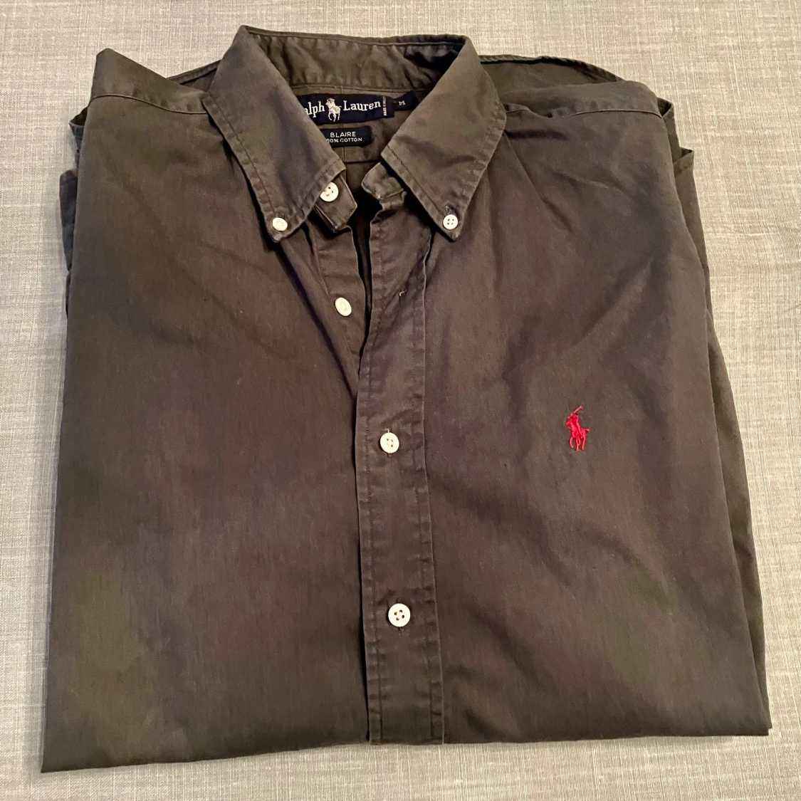 Mörkgrön skjorta från Ralph Lauren med klassisk krage och knappar framtill. Broderad röd Polo-logga på bröstet ger en snygg kontrast. Skjortan är långärmad och oversized, snarare Large än Medium. Se mått på bild.