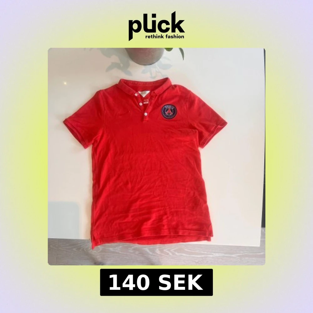 Säljer en röd pikétröja från Nike med Paris Saint-Germain-logga på bröstet. Klassisk krage med knappar och korta ärmar. Perfekt för dig som gillar fotboll och vill ha en sportig stil. Materialet är mjuk bomull som andas bra.