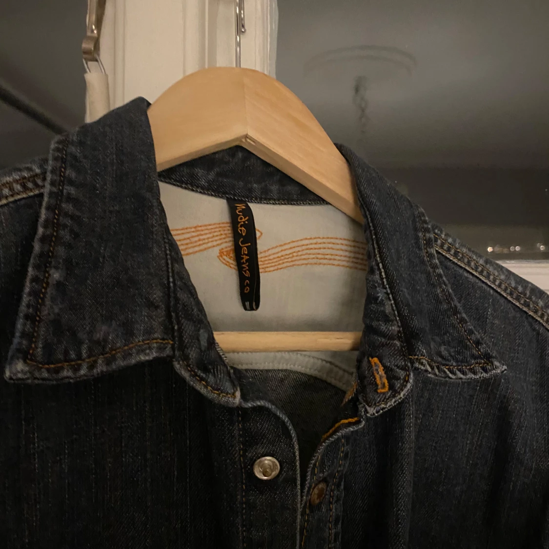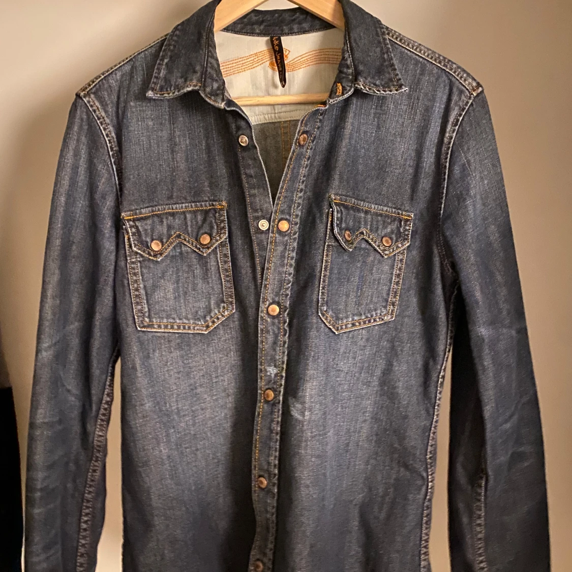 Säljer denna riktigt schyssta jeansskjorta från nudie jeans. Riktigt bra kvalité på denimtyget på denna skjorta, då nudie gör bra grejer. Lite slitningar fram mitt på skjortan som jag antar ska vara där. Klassisk blå färg, passar dig som har storlek M bra! Skriv jättegärna om du har frågor eller prisförslag!