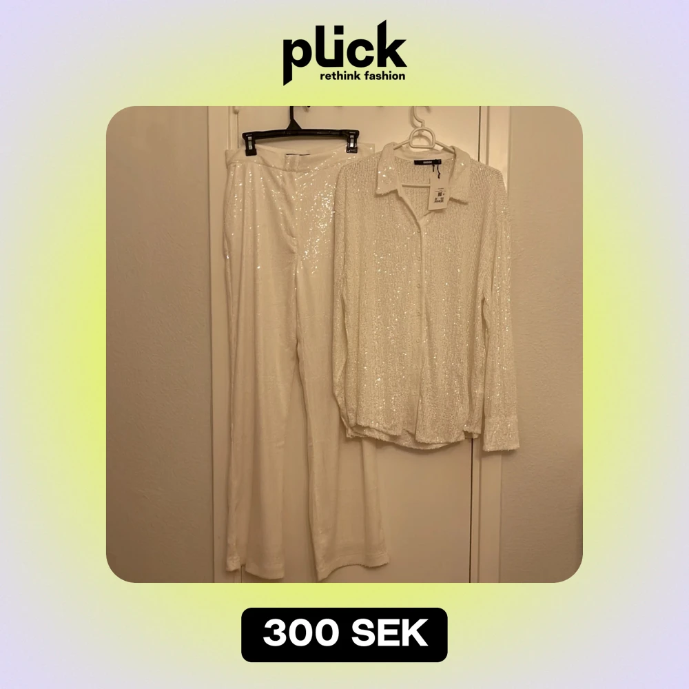 Säljer en superglittrig vit blus stl L från BIKBOK, perfekt för fest! Den har långa ärmar och är täckt med paljetter som verkligen fångar ljuset. Blusen har en klassisk krage och knappar framtill. Perfekt för att lysa upp vilken kväll som helst! Och säljer även med blusen matskandaler glittriga byxor stl 42