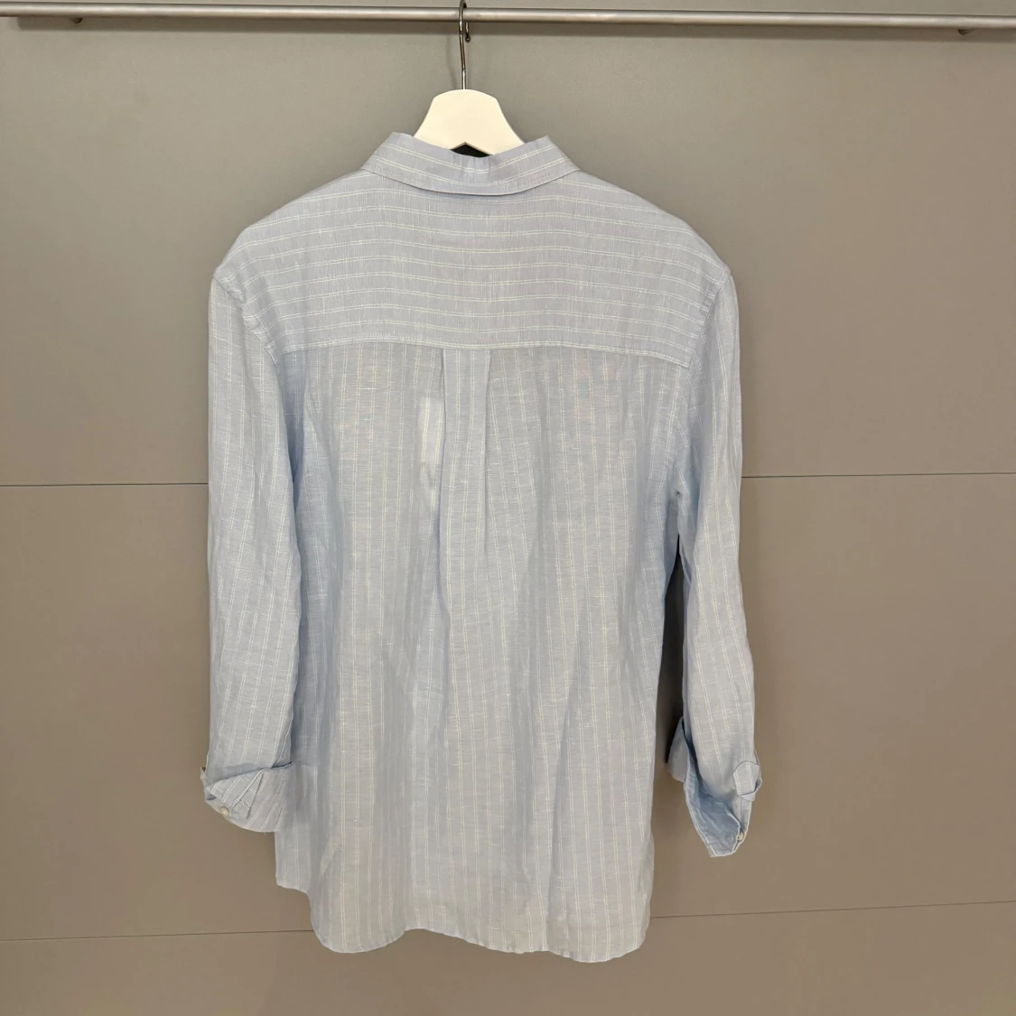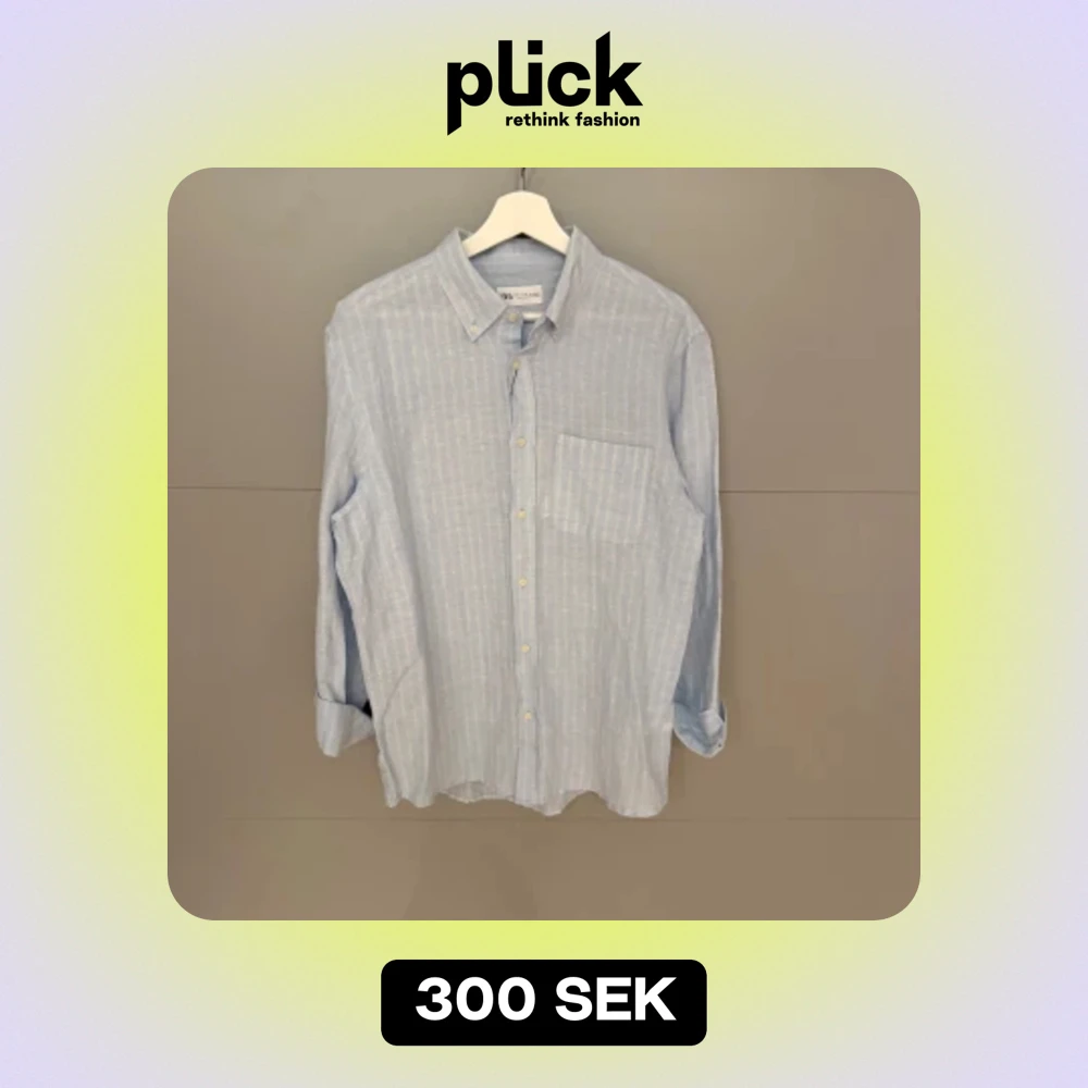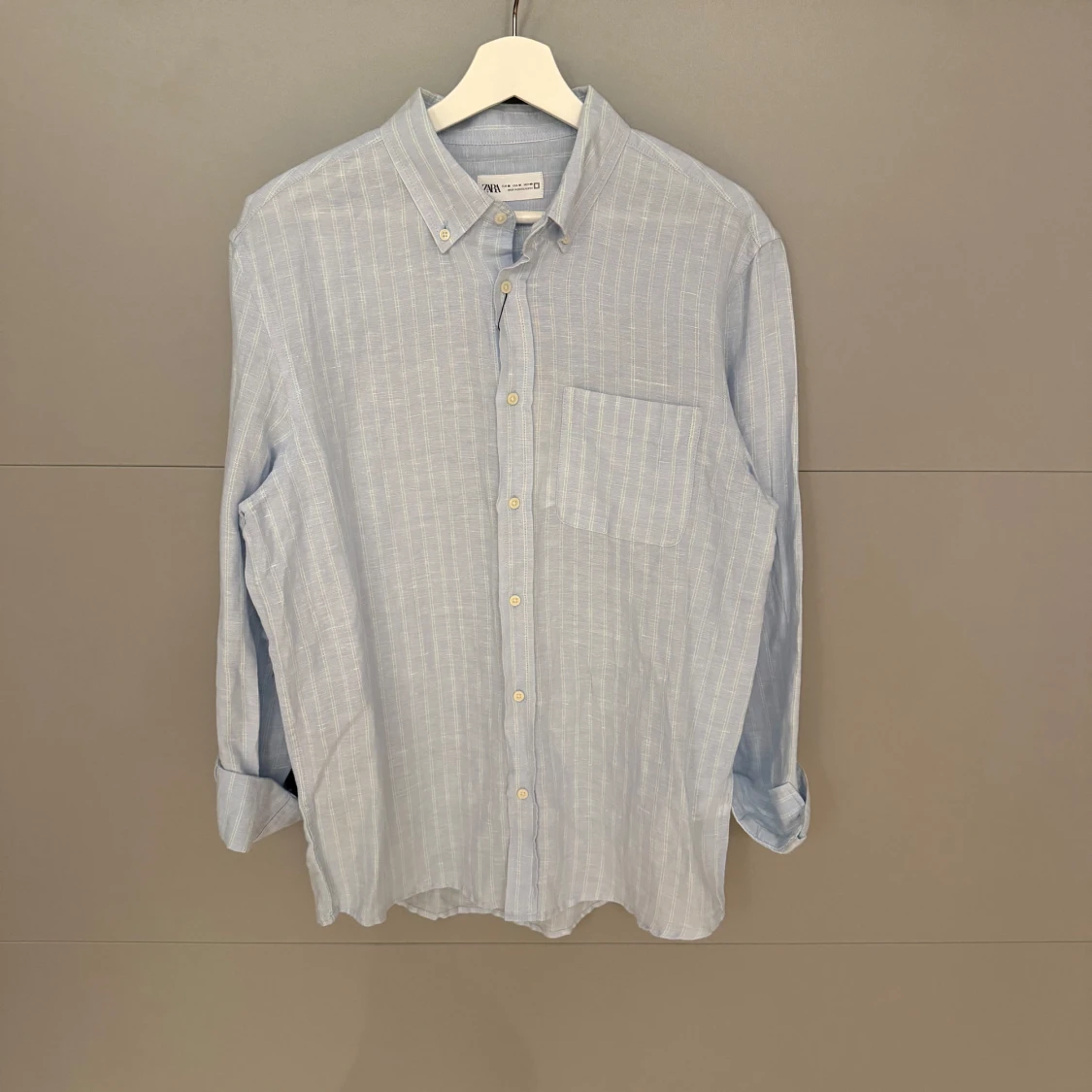 Säljer en stilren ljusblå skjorta från Zara. Den är randig och har en klassisk krage med knappar. Skjortan är långärmad och har en bröstficka. Perfekt för både vardag och fest!
