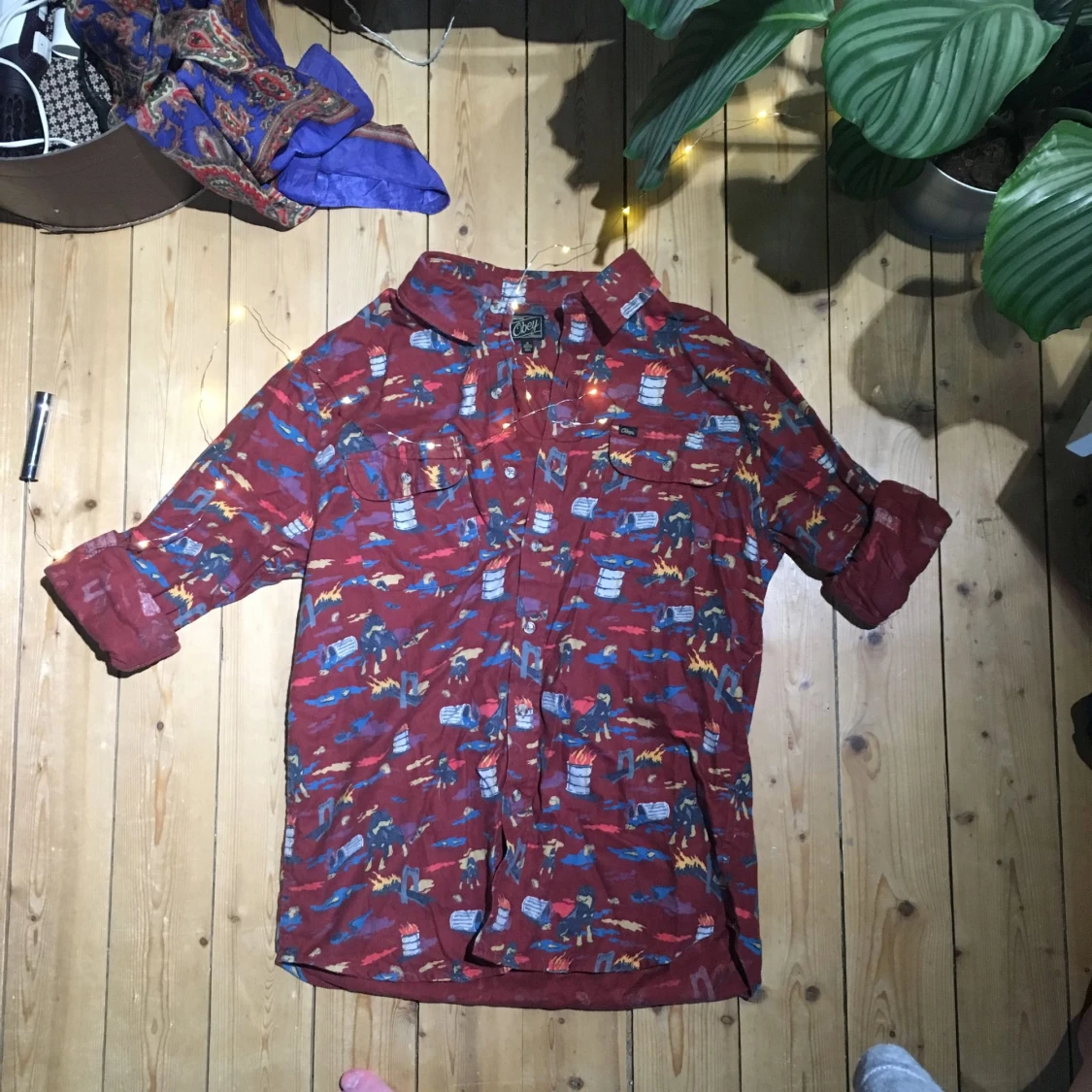 Cool skjorta från Obey, herrstorlek M men sitter snyggt som oversize på kvinna också! Frakt tillkommer, tar betalt över swish! Katt finns i hemmet