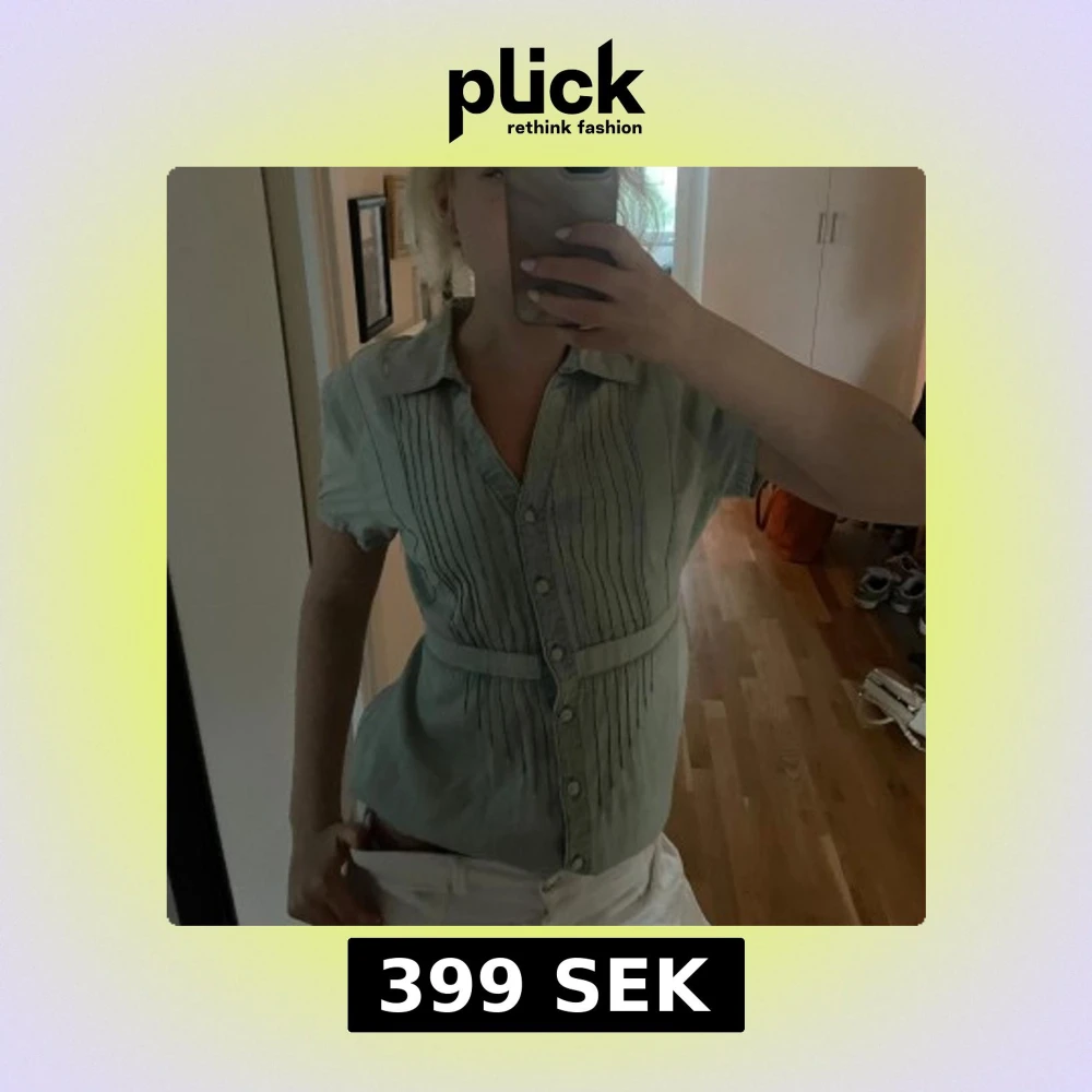 Superfin turkos ish jeansskjorta från gamla KappAhl med korta ärmar, knappar framtill och snygga veckade detaljer både fram och bak. Skjortan har en markerad midja med knytband i ryggen och klassisk krage. Säljs inte längre då det är en gammal design💕st.40 men passar mig som brukar ha s så skriver s