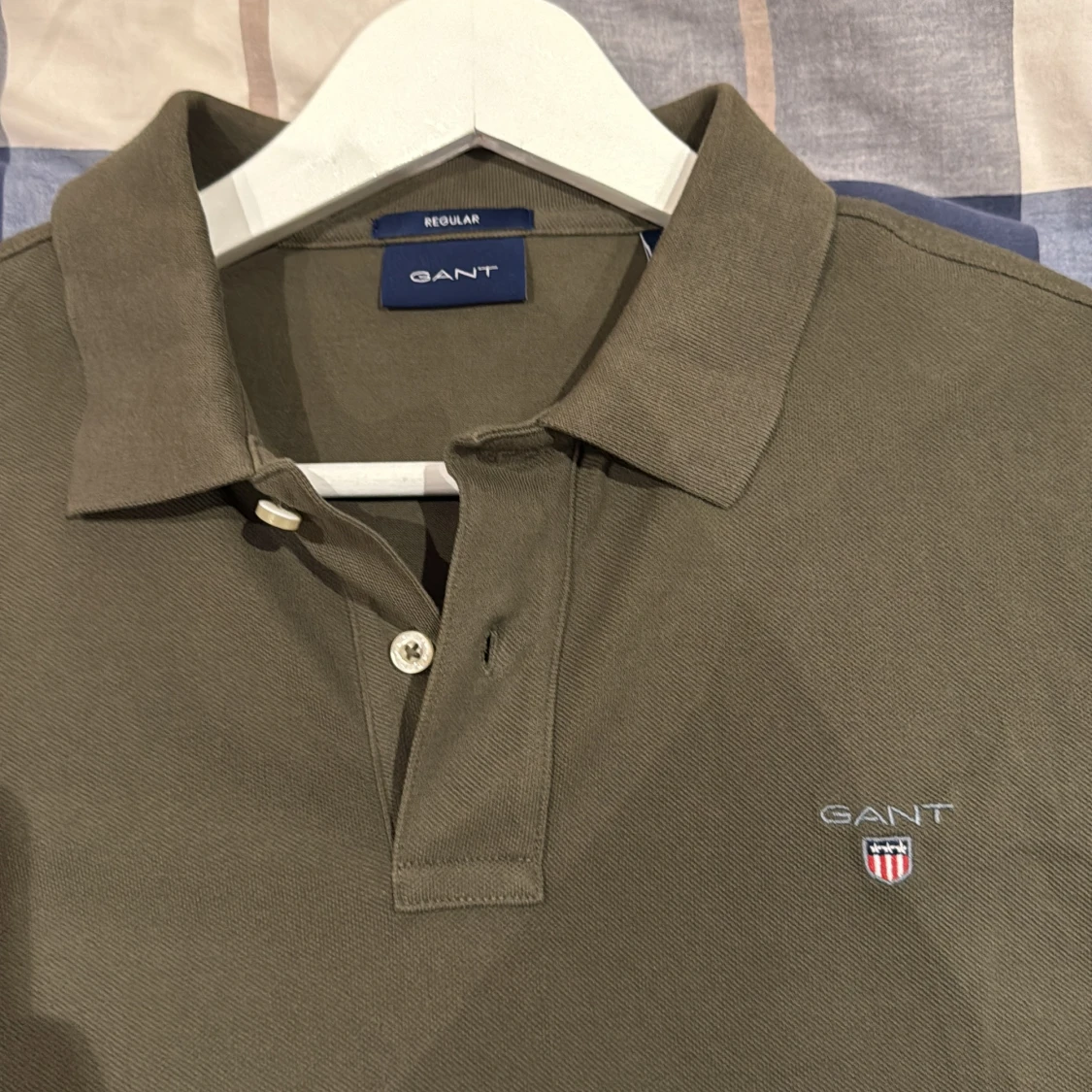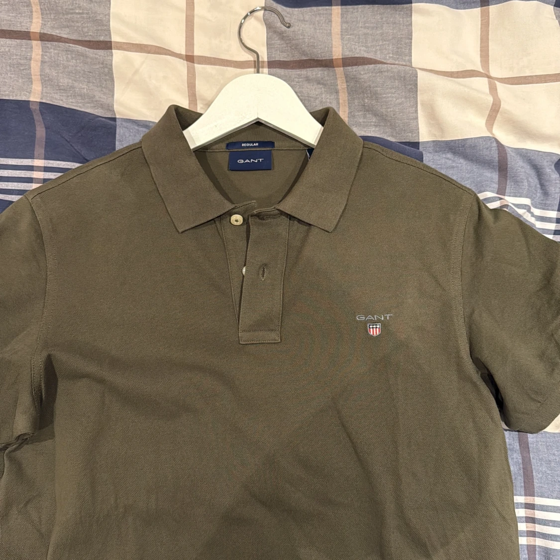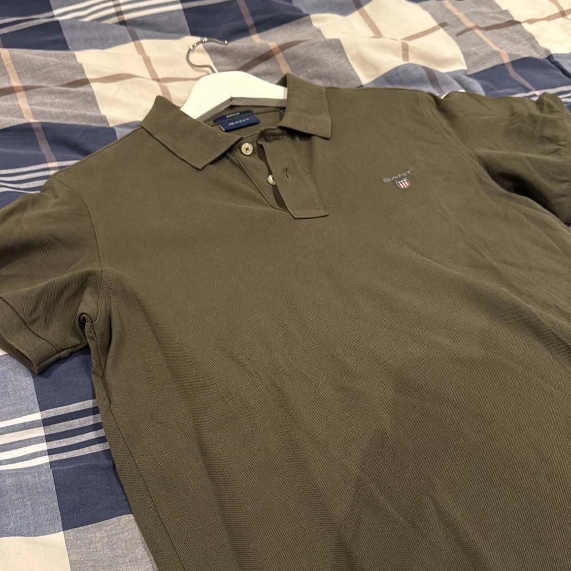Snygg olivgrön pikétröja från GANT med klassisk krage och två knappar framtill. T-shirten har korta ärmar och GANT-logga broderad på bröstet. Tillverkad i mjuk bomull som känns skön mot huden. Perfekt för en chill och stilren look.