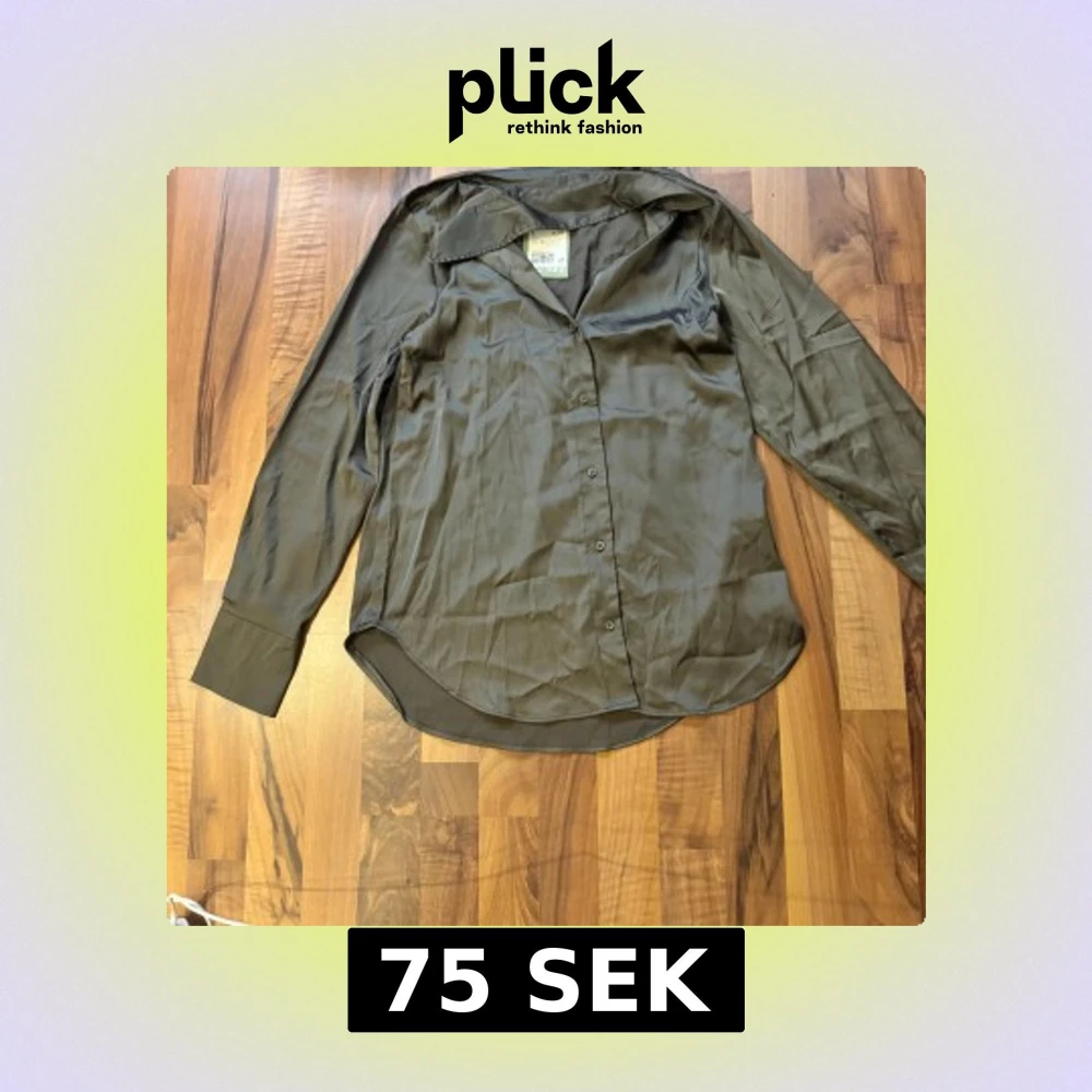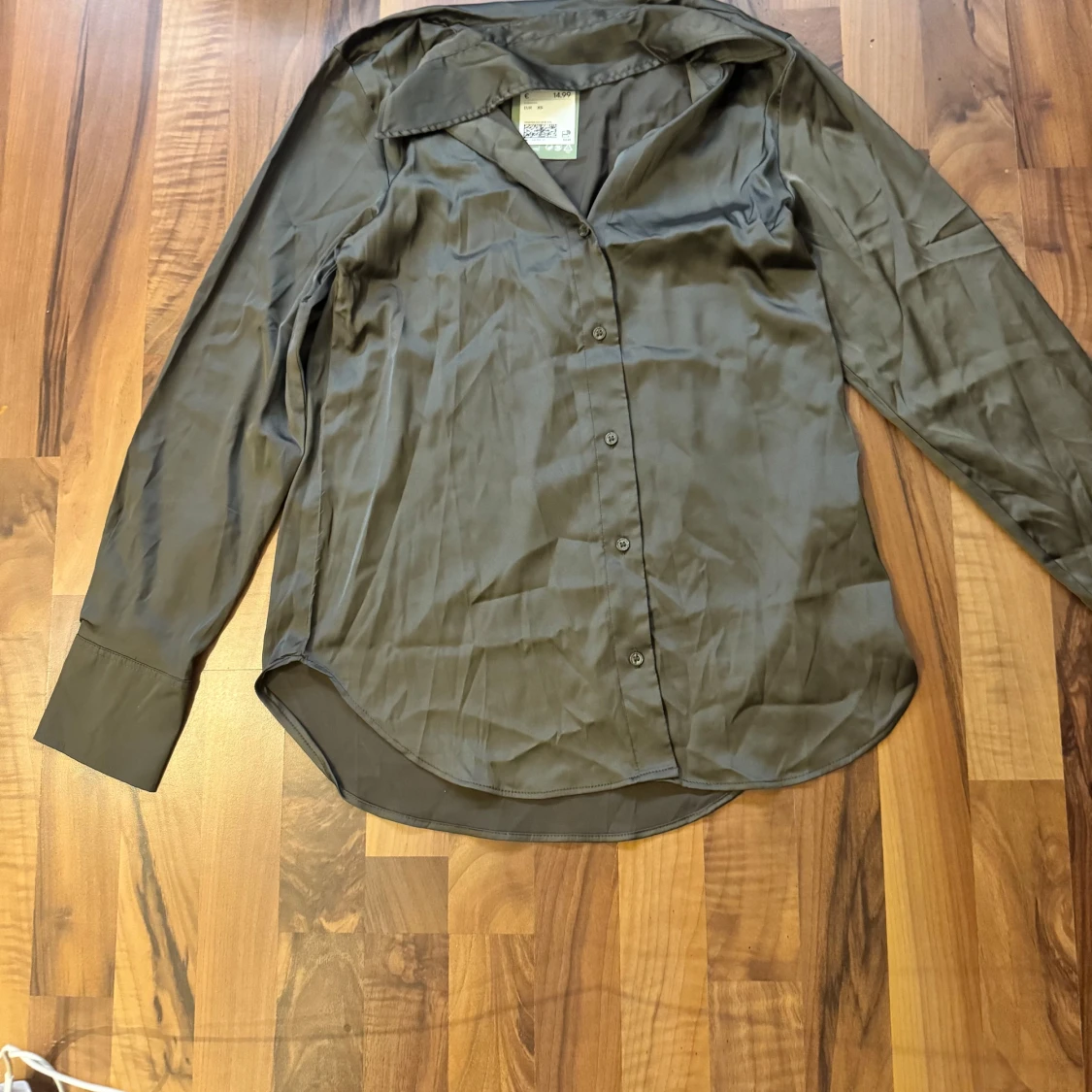 Olivgrön skjorta i satinliknande material med klassisk krage och knäppning framtill. Skjortan har långa ärmar med breda manschetter och en lätt glansig finish som ger en stilren vibe. Perfekt för dig som gillar en clean och enkel look.