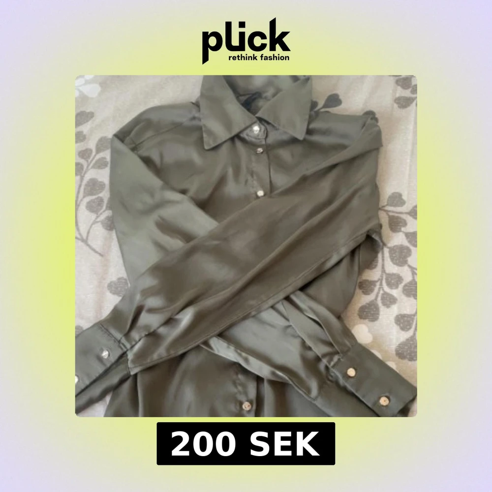 Snygg olivgrön skjorta med silkeslen känsla och klassisk krage. Skjortan har långa ärmar med knappar vid manschetterna och knäppning framtill. Bara använts en gång då den är inte direkt min still längre.