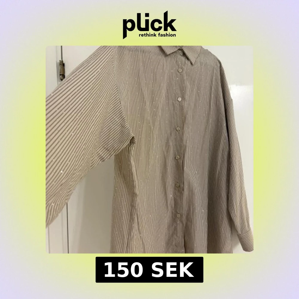 Säljer en beige skjorta med vita ränder och små pärlor över hela tyget. Skjortan har klassisk krage, knäppning framtill och långa ärmar. Använd 1 gång. Meddela för fler bilder.