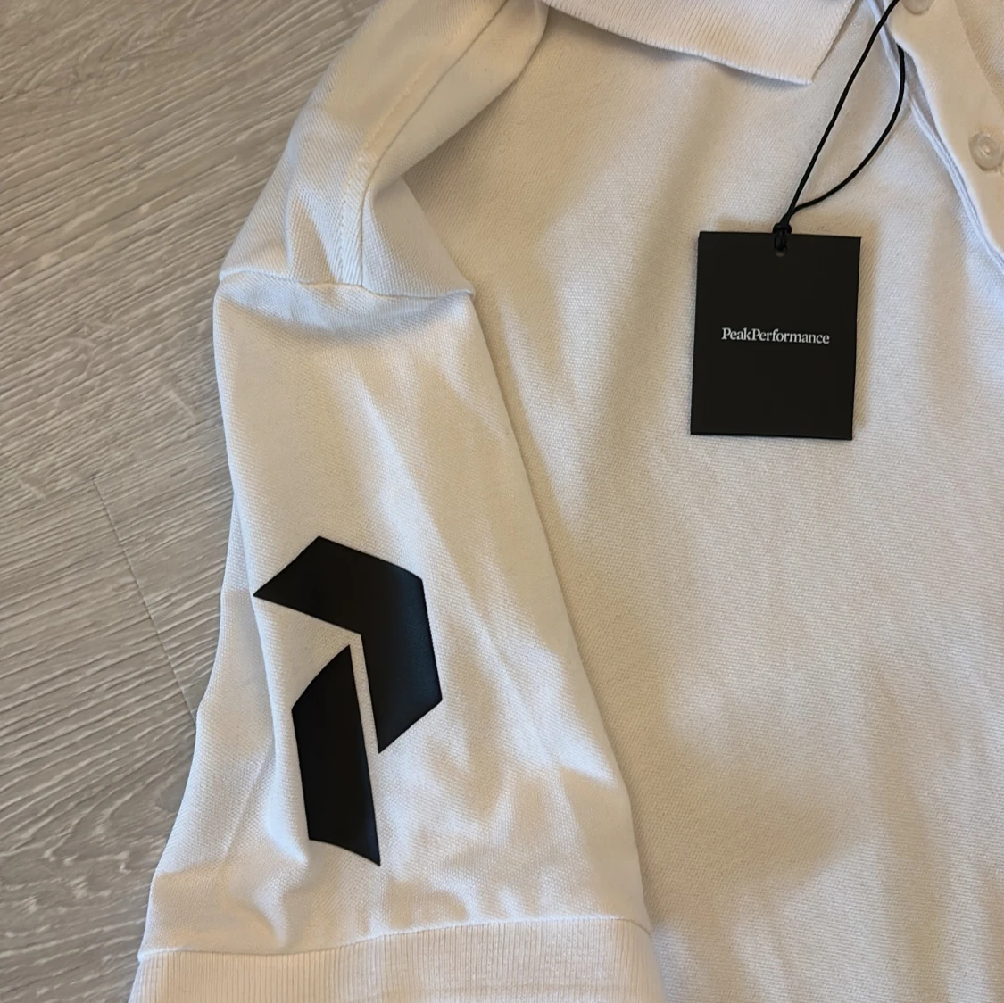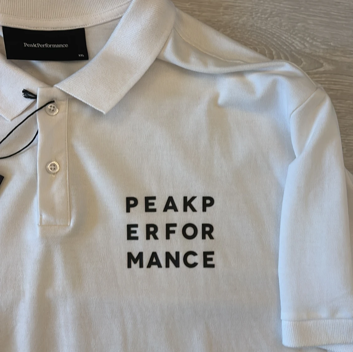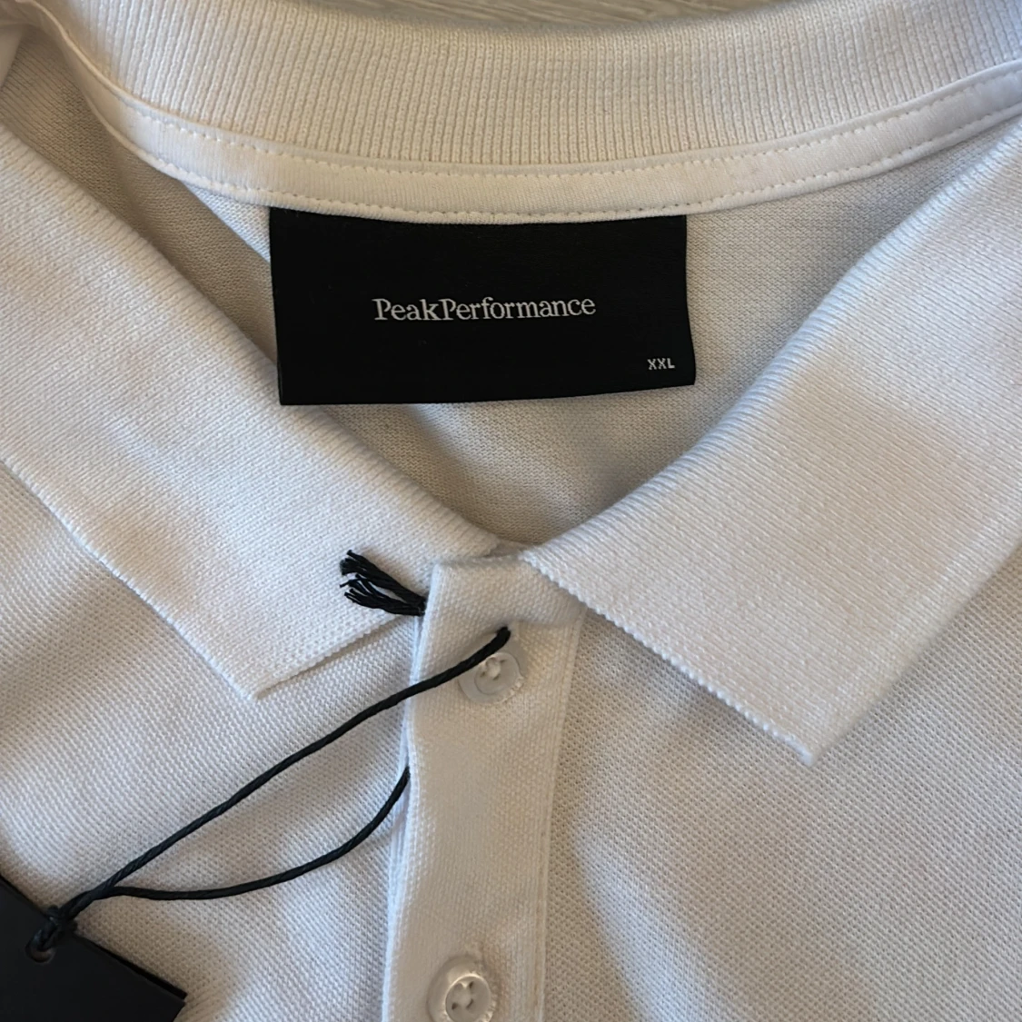 Vit pikétröja från Peak Performance i storlek XXL. Klassisk krage med knappar framtill och svart logga på bröstet samt ärmen. Tillverkad i bomull, perfekt för en clean och sportig look.