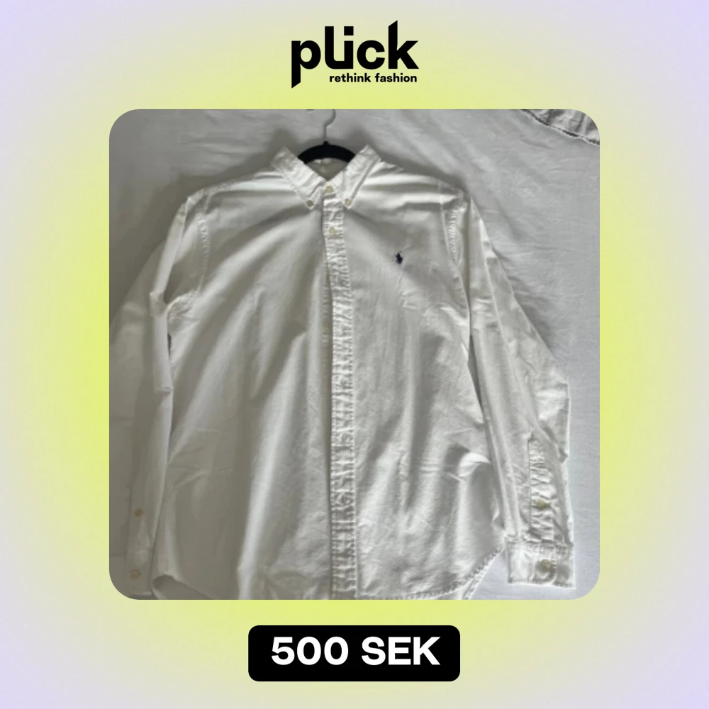 En Ralph Lauren skjorta i vit med mörkblå logga storlek L. En mindre brun fläck som jag inte vårdat med vanish men kan ha möjlighet att försvinna. Typisk sommarskjorta som är köpt under sommaren 2023z