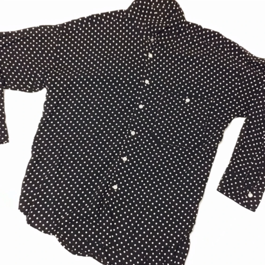 Helt ny skjort från pop med möster utav små vita prickar i det mörkblåa tyget som är utav ett tunnare rayon tyg (silke) Skjortan kortare sydd i stilen.