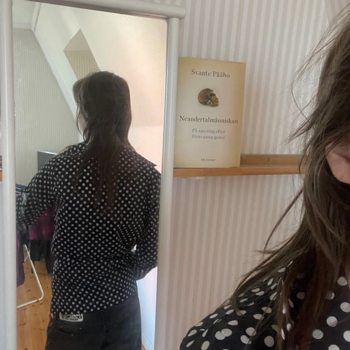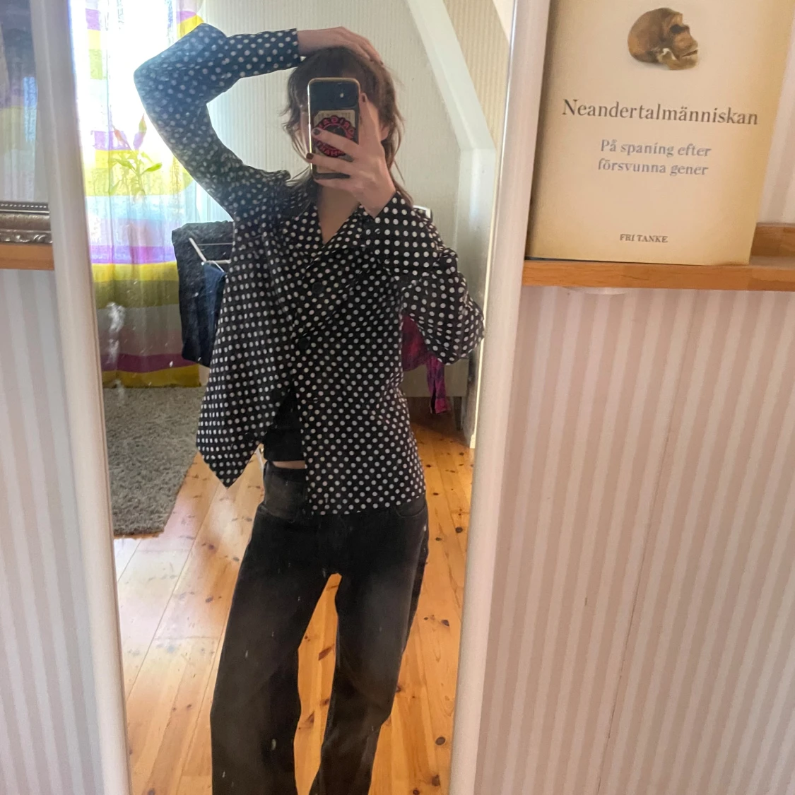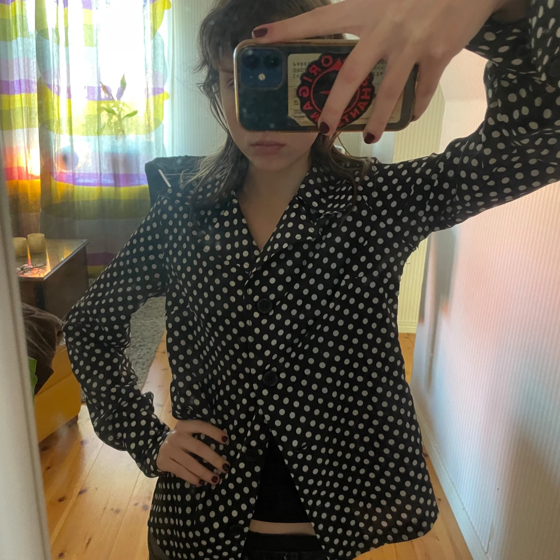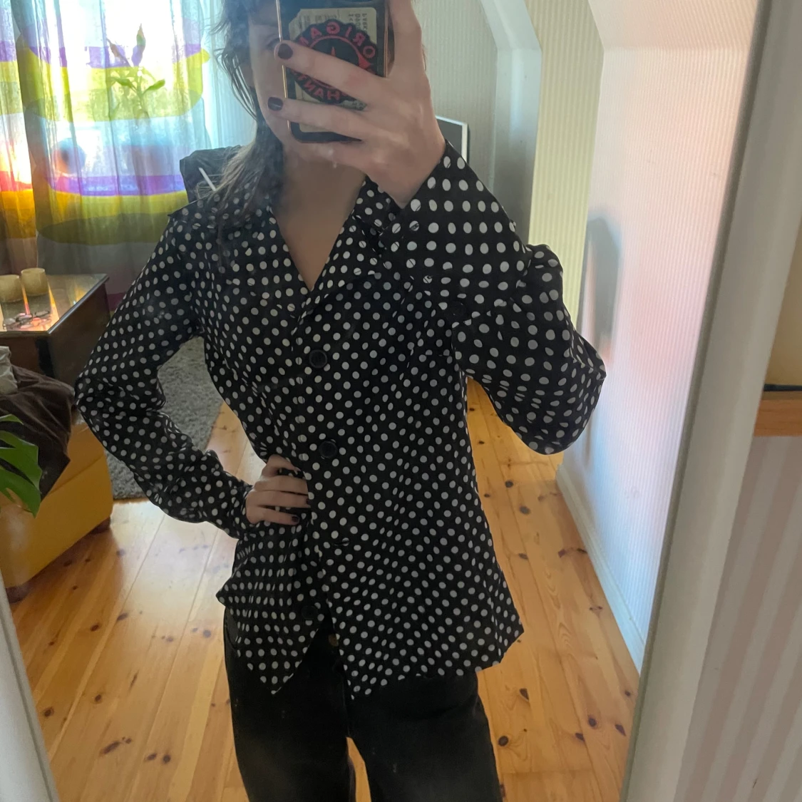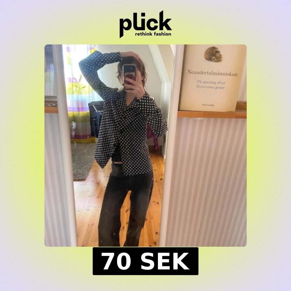 En prickig skjorta med knappar och krage. Skjortan är från min gammelfarmor på 60/70 talet kanske. Fortfarande toppskick! Skulle säga att den sitter som en s/m.