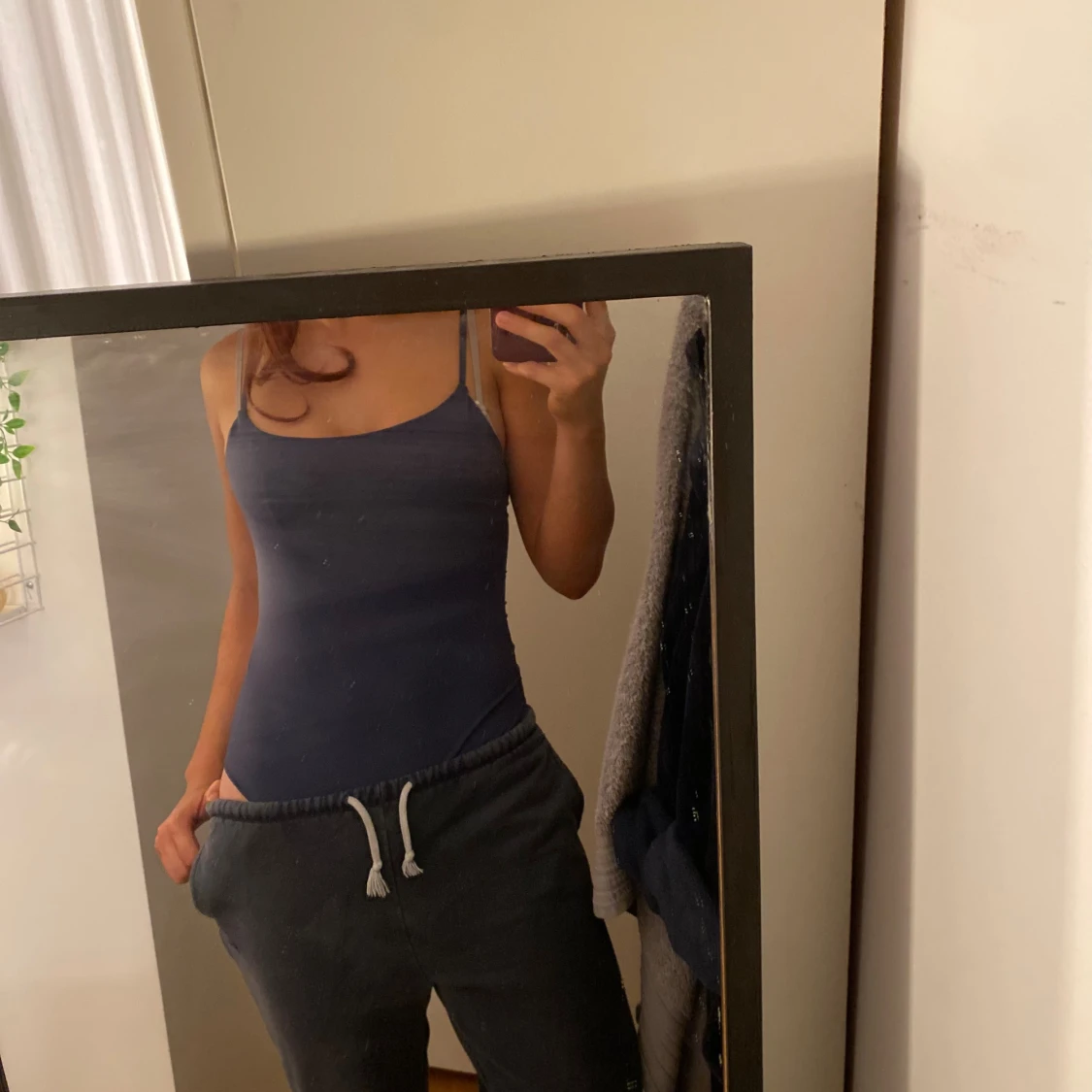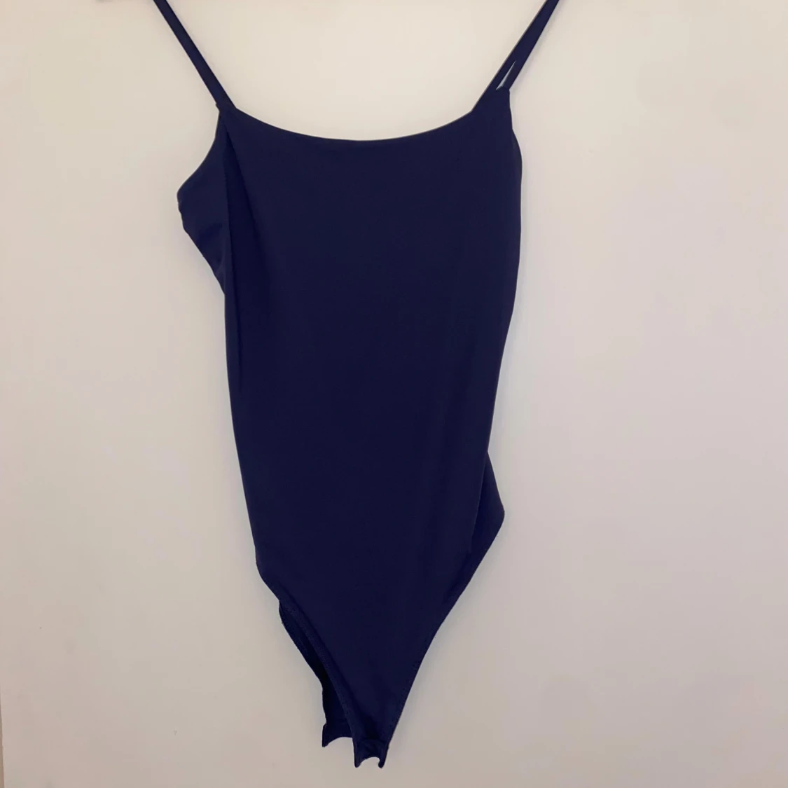 Säljer en stilren mörkblå baddräkt med smala axelband och klassisk, rak urringning. Perfekt för dig som gillar en clean och minimalistisk look på stranden eller vid poolen. Sitter tight och följsamt mot kroppen.