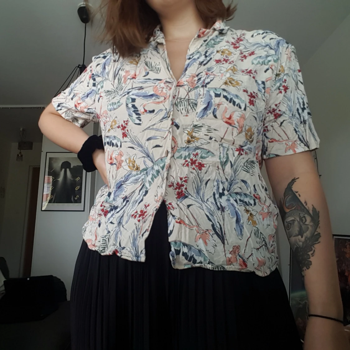 Skjorta i flamingomönster med fina träknappar. Extremt skrynklig men går att ordna med strykjärn🌿