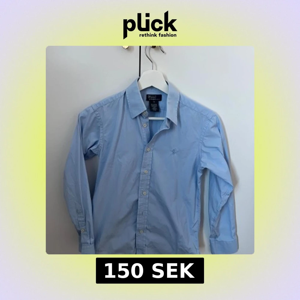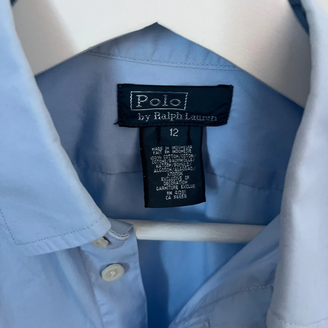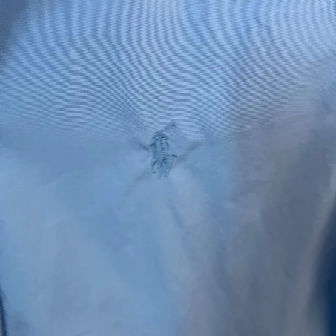 Säljer en klassisk ljusblå skjorta från Polo Ralph Lauren. Skjortan har långa ärmar och knappar framtill. Den är broderad med den ikoniska logotypen på bröstet. En knapp är skadad på ärmen och en liten fläck som knappast syns över den broderande loggan.