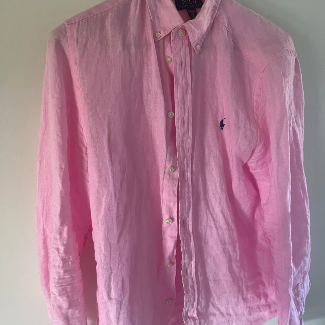 Säljer en stilren rosa skjorta från Polo Ralph Lauren med klassisk krage och knappar framtill. Skjortan har en broderad logotyp i mörkblått på bröstet och är långärmad. Perfekt för en avslappnad men ändå uppklädd look. XL men sitter som en M