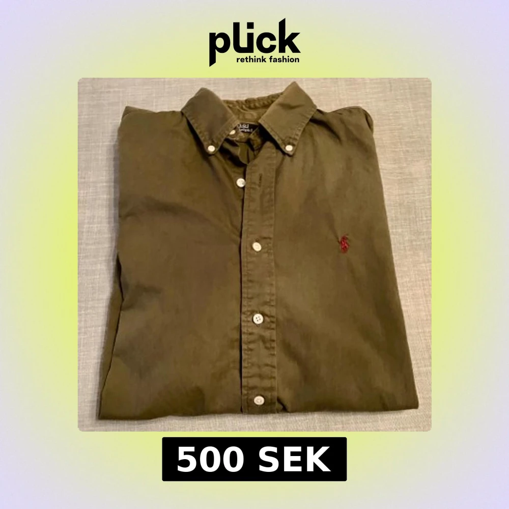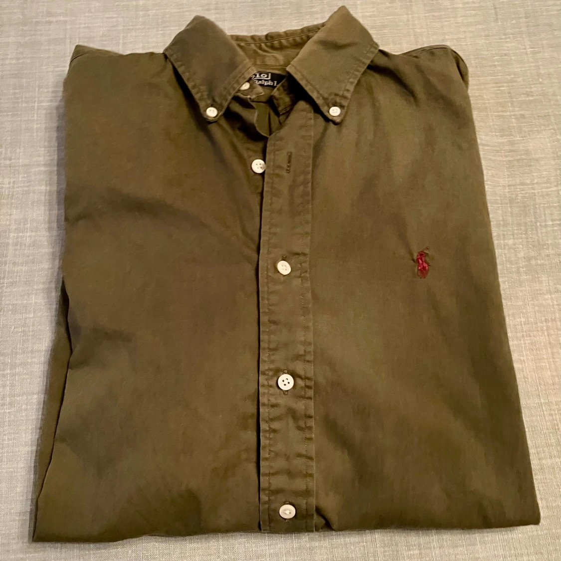 Olivgrön skjorta från Polo Ralph Lauren med klassisk krage och vita knappar framtill. Broderad röd logga på bröstet ger en snygg detalj. Skjortan är långärmad och oversized, snarare Large än Medium. Se mått på bild.