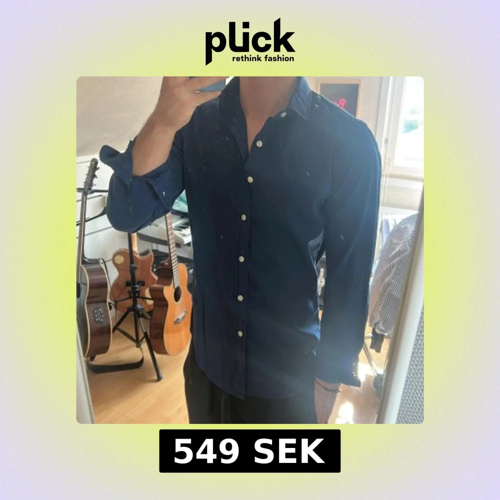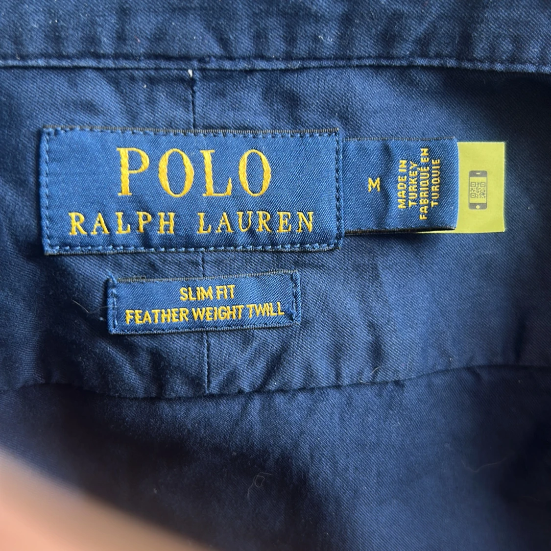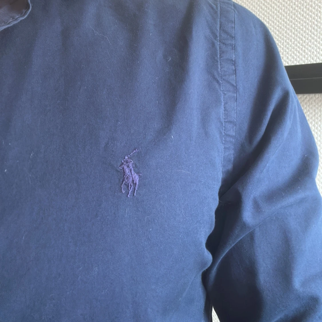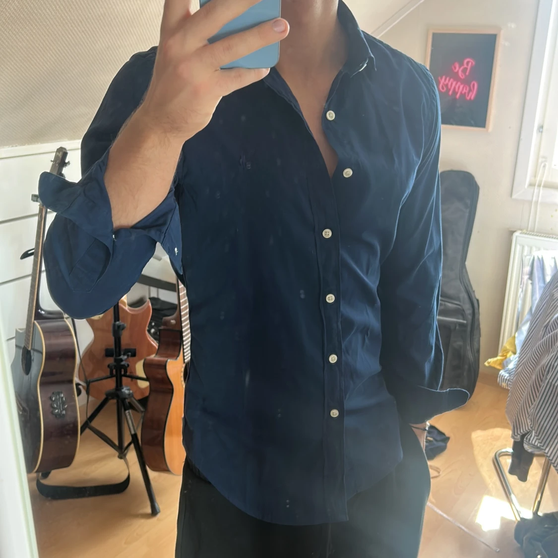 Säljer en klassisk mörkblå skjorta från Ralph Lauren med broderad logga på bröstet. Skjortan har lång ärm, vita knappar och en slim passform. Perfekt för dig som gillar stilrena plagg med snygga detaljer.