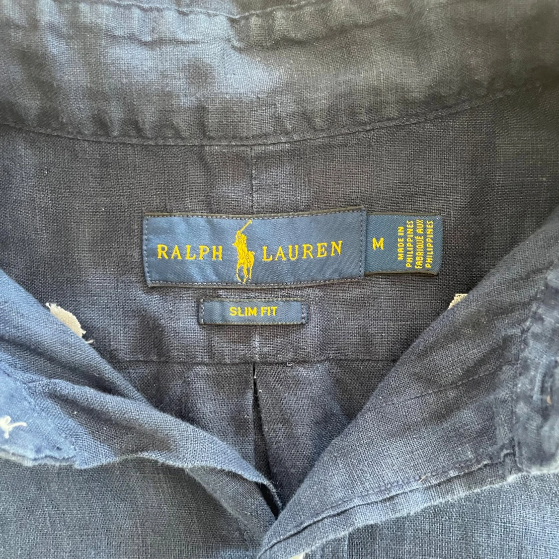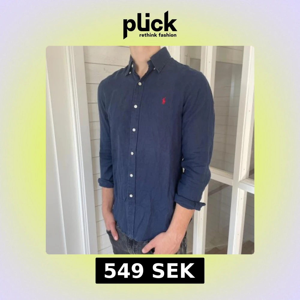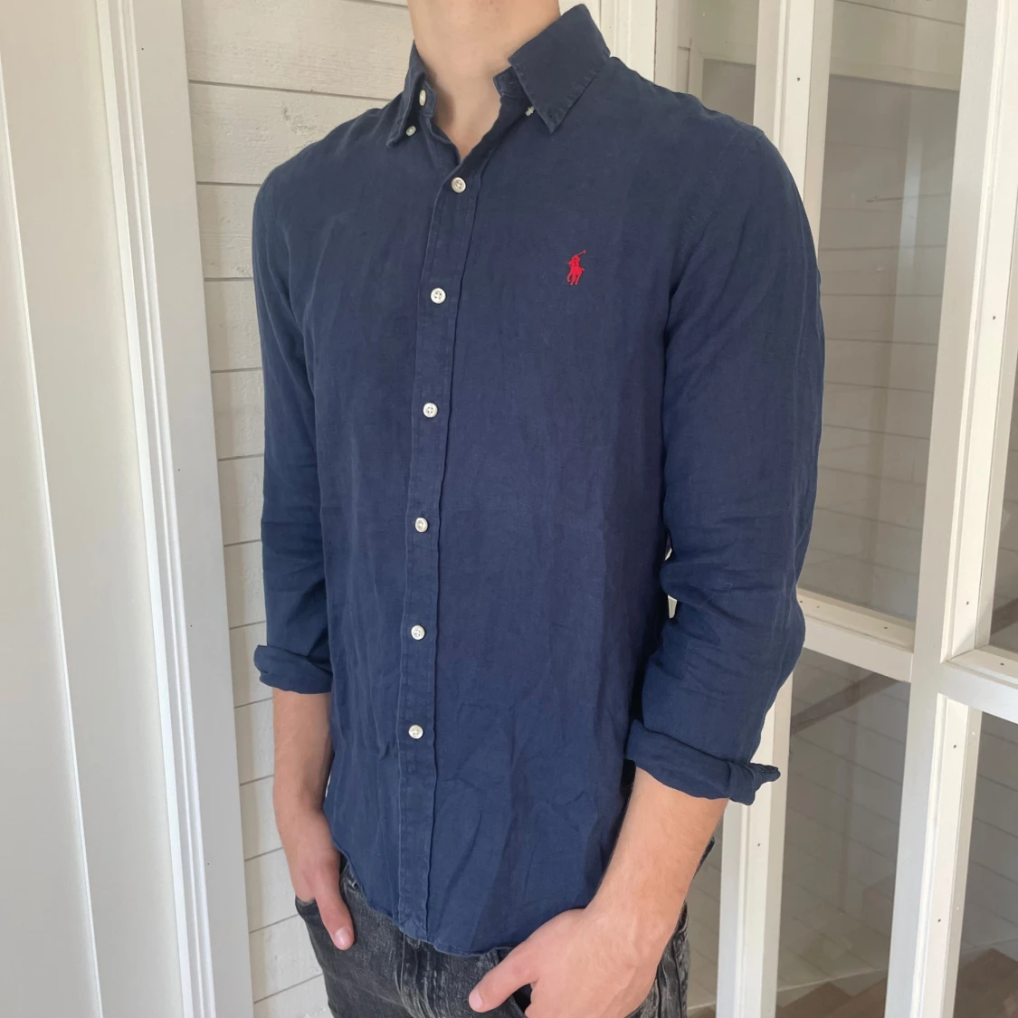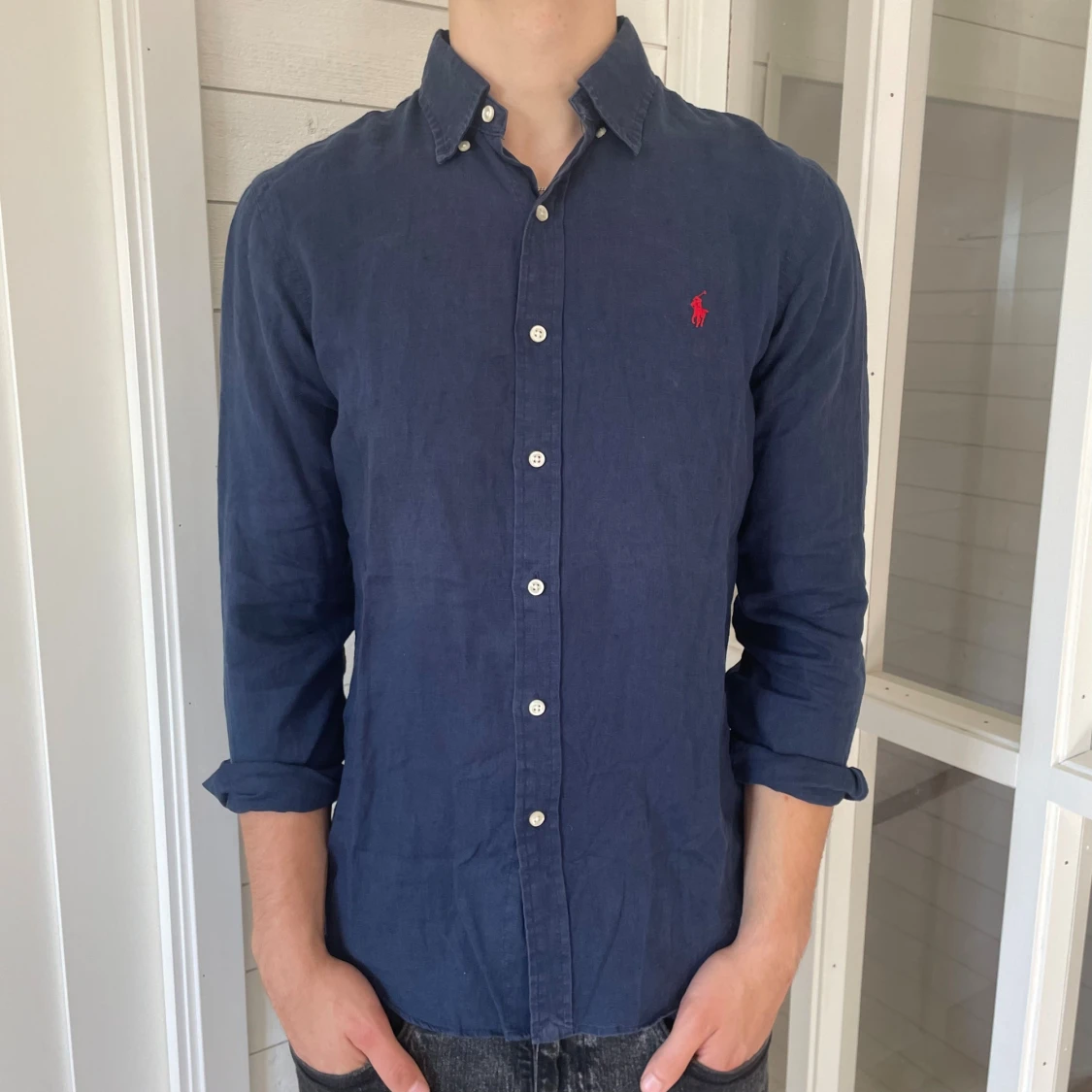 Säljer denna riktigt snygga mörkblåa linneskjortan från Ralph lauren! Den är i mycket bra skick och har inga defekter, storlek M modell slim fit, den är 80 cm lång och 50 cm bred under armhålorna, jag på bilderna är 184 cm och väger 80 kg, hör gärna av dig vid frågor!