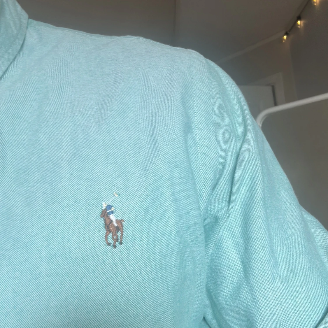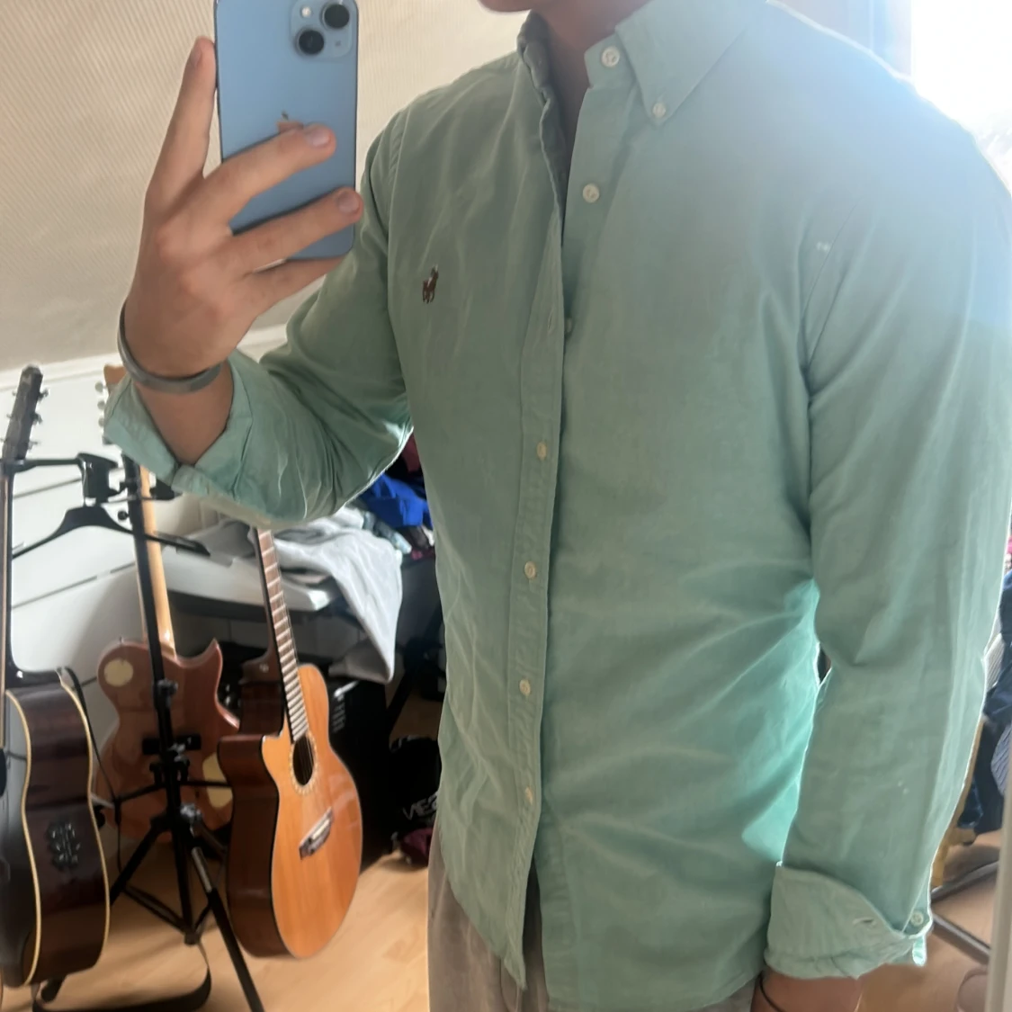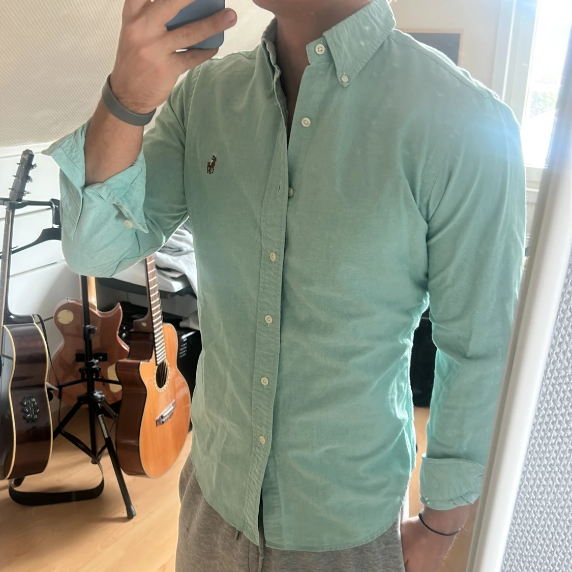 Snygg ljusgrön skjorta från Ralph Lauren med en broderad logotyp på bröstet. Skjortan har långa ärmar och knappar framtill samt vid kragen. Perfekt för en stilren look.