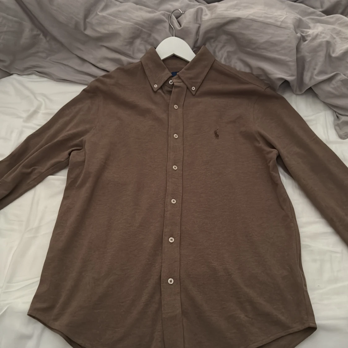 Snygg brun skjorta från Polo Ralph Lauren i lätt och mjuk bomull. Klassisk button-down krage, långa ärmar och knäppning framtill. Diskret broderad logga på bröstet. Perfekt för dig som gillar stilrena och tidlösa plagg. Aldrig använt skulle säga att den passar bra på fina middagar!