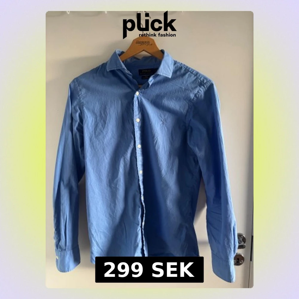 Säljer en stilren blå skjorta från Polo Ralph Lauren i slim fit. Skjortan är tillverkad i tunn bomullstwill och har klassisk krage, vita knappar och långa ärmar. Perfekt för dig som gillar en clean och tidlös look.