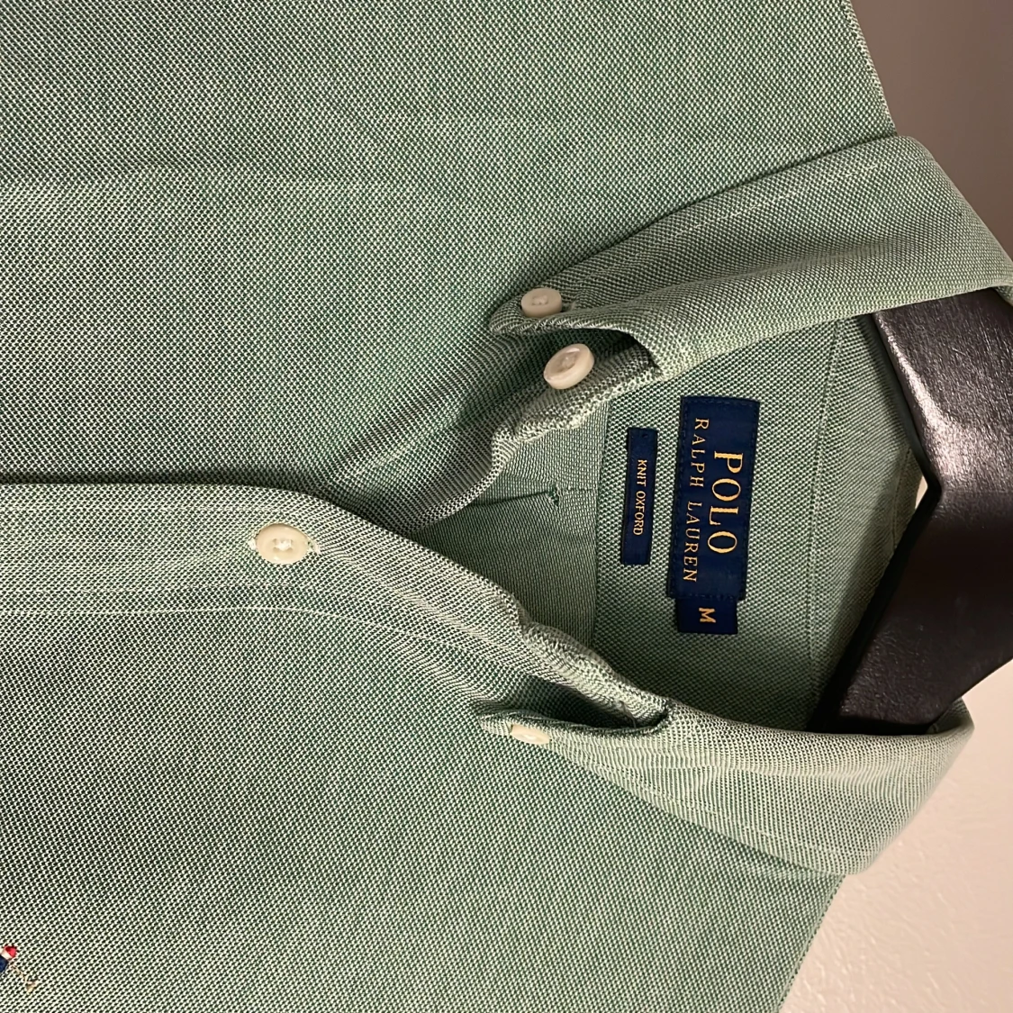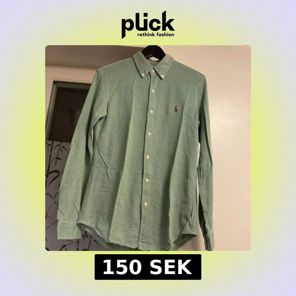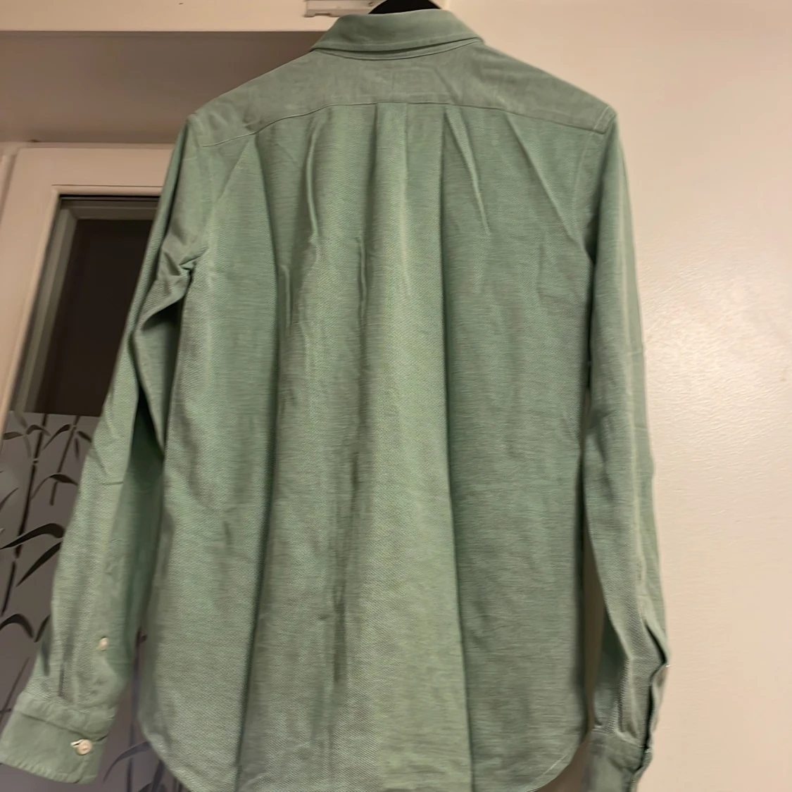 Snygg grön skjorta från Polo Ralph Lauren med klassisk button down-krage och broderad logga på bröstet. Skjortan är i bomull, har långa ärmar och vita knappar framtill. Perfekt för dig som gillar stilrena och tidlösa plagg. Obs .skjortan har ett litet hål på vänster axel och längre till höger som inte syns alls