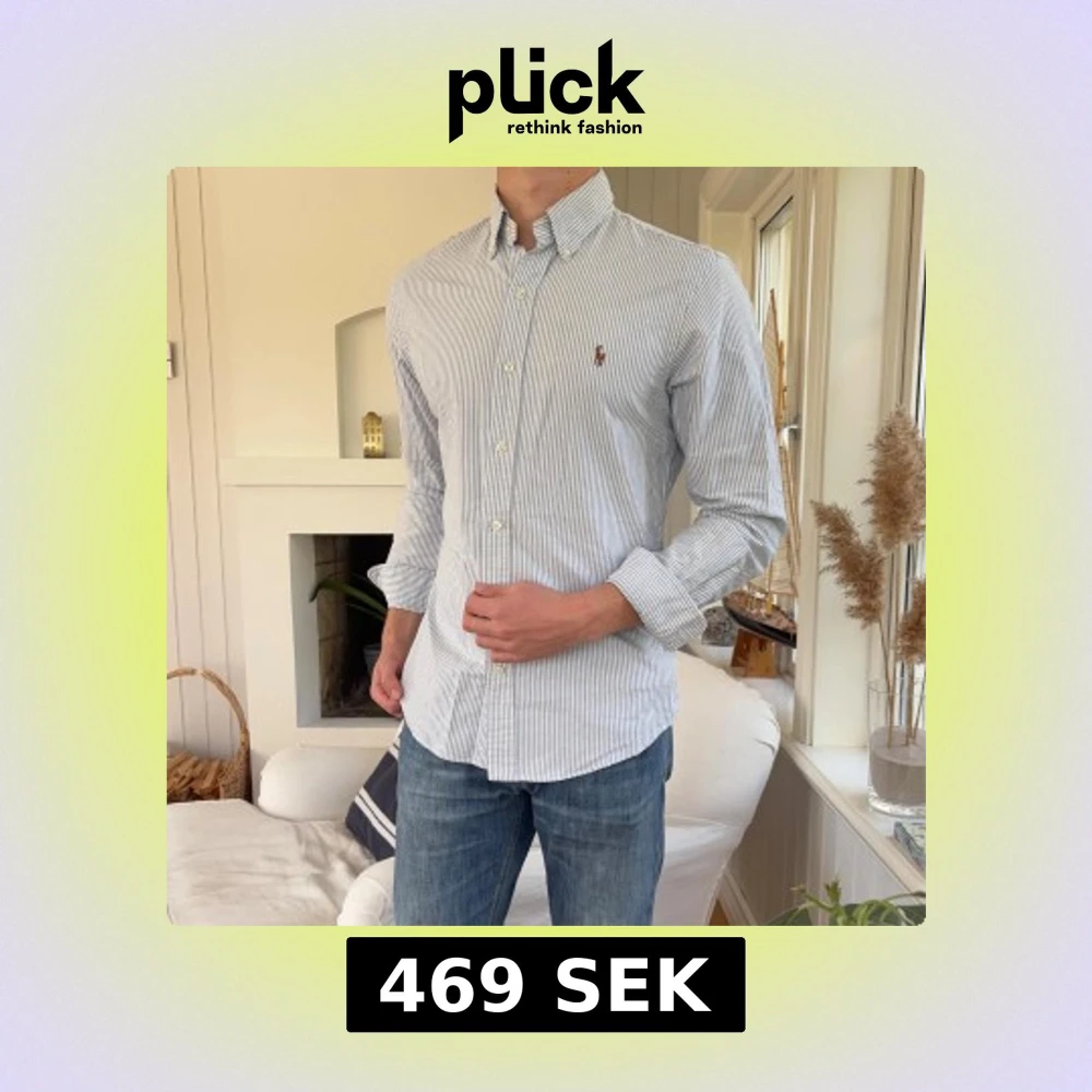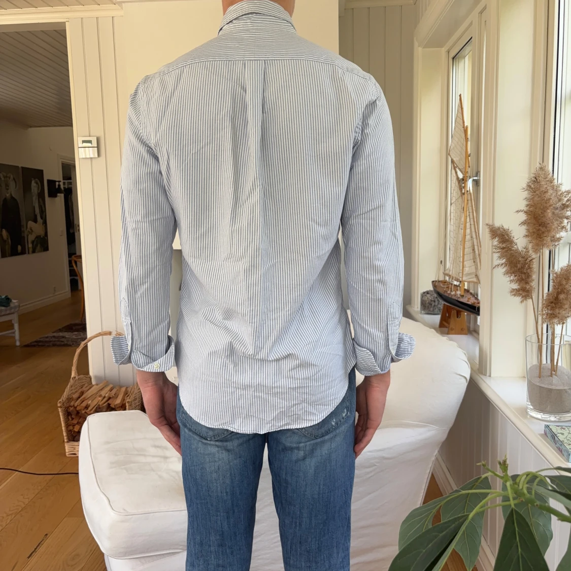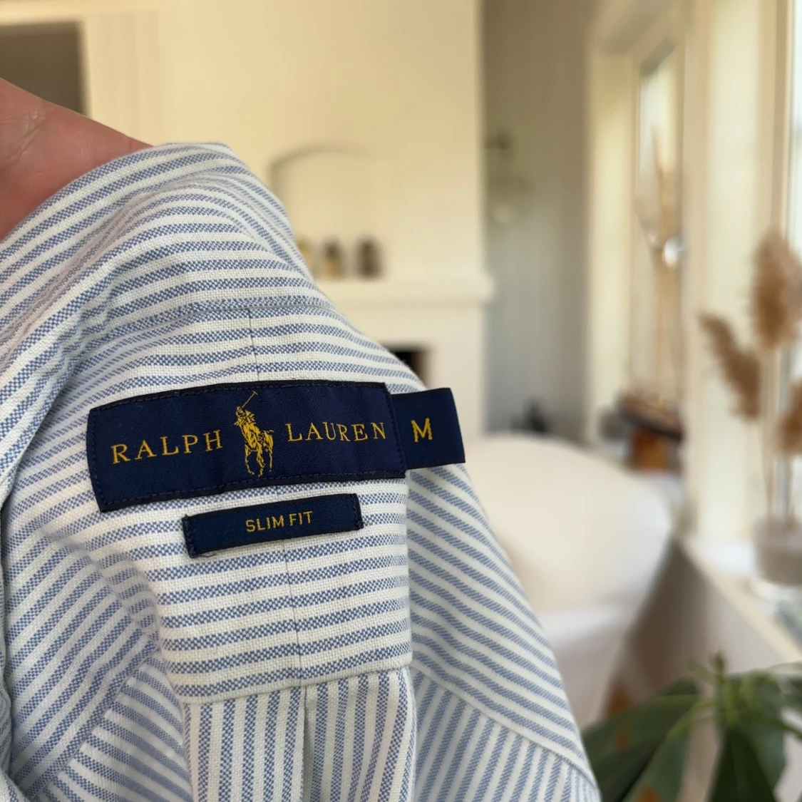 Snygg slim fit skjorta från Ralph Lauren i vitt och ljusblått med tunna ränder. Klassisk button-down krage, broderad logga på bröstet och långa ärmar. Skjortan är i bomull och har knappar framtill. Perfekt för en clean och stilren look.