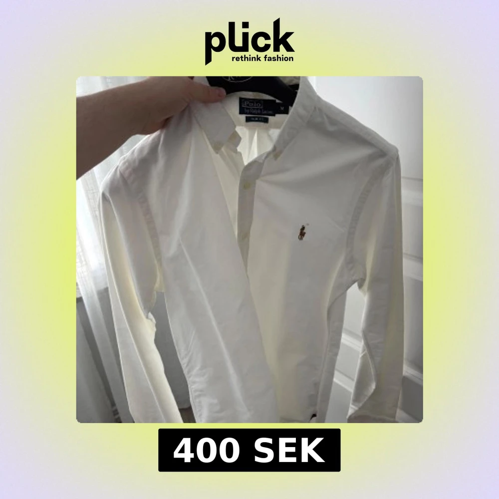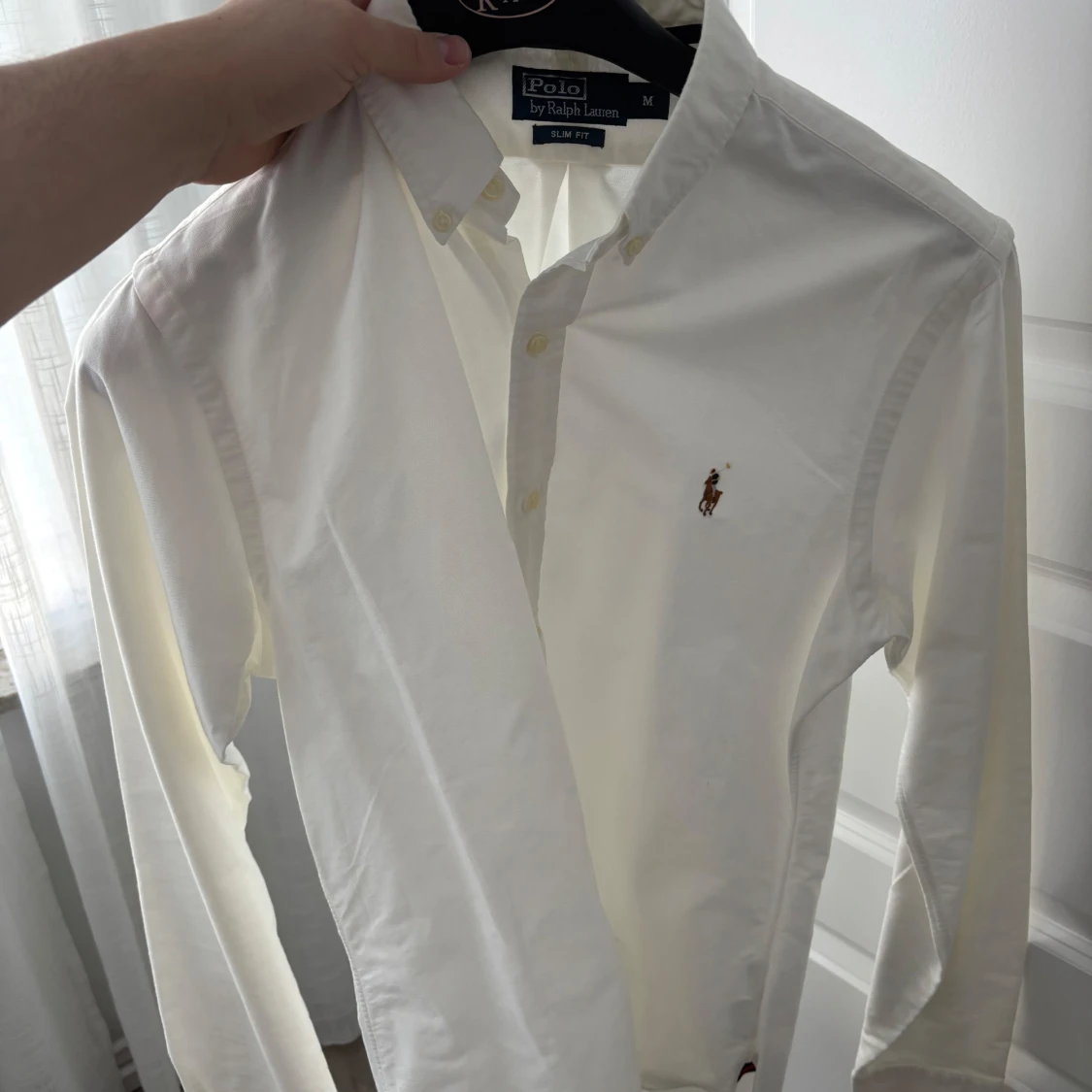 Säljer en klassisk vit skjorta från Ralph Lauren med broderad logga på bröstet. Skjortan har långa ärmar och knappar framtill. Perfekt för en stilren look.