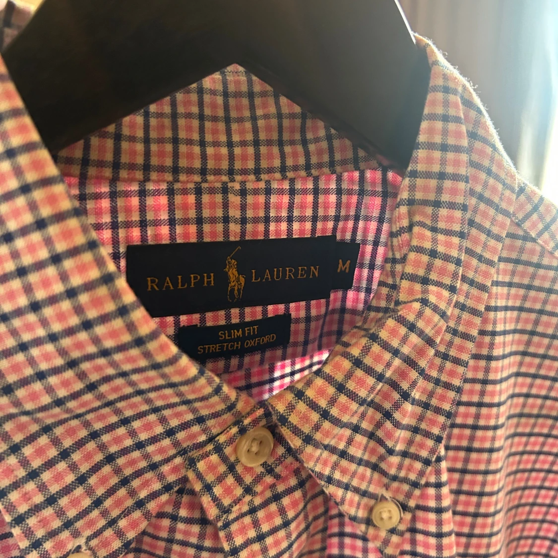 Säljer en slim fit stretch oxfordskjorta från Ralph Lauren i storlek M. Skjortan har ett rutigt mönster i rosa, blått och vitt, klassisk krage och knäppning framtill. Perfekt för dig som gillar stilrena och färgglada skjortor.